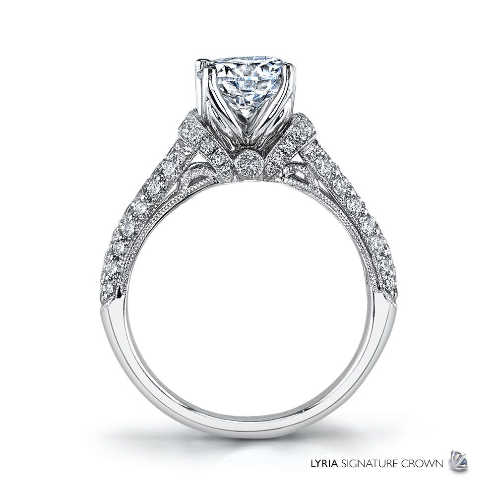 Breath-taking from every angle, the LYRIA Signature Crown presents a brilliant center stone wrapped in rows of sparkling white diamonds and intricate filigree detailing. Available in Platinum, as well as 18K White, Yellow or Rose Gold.