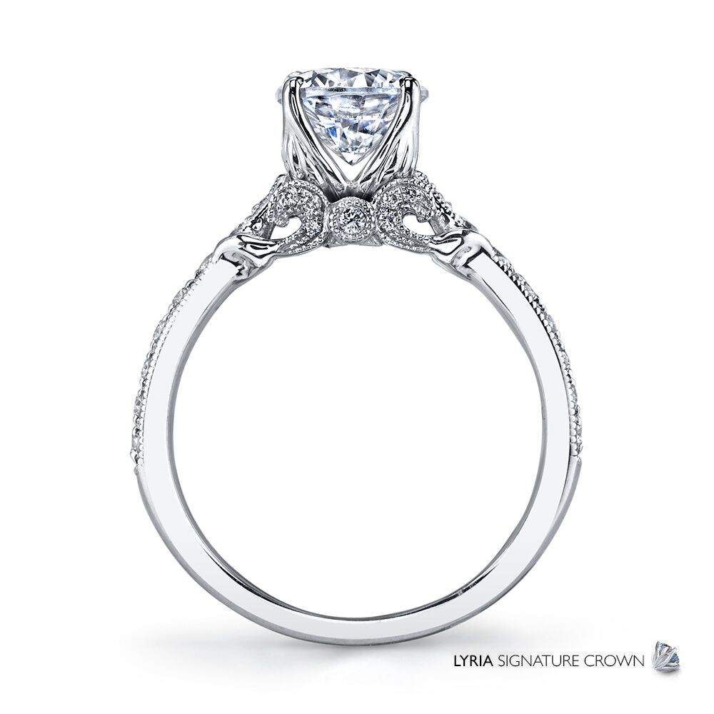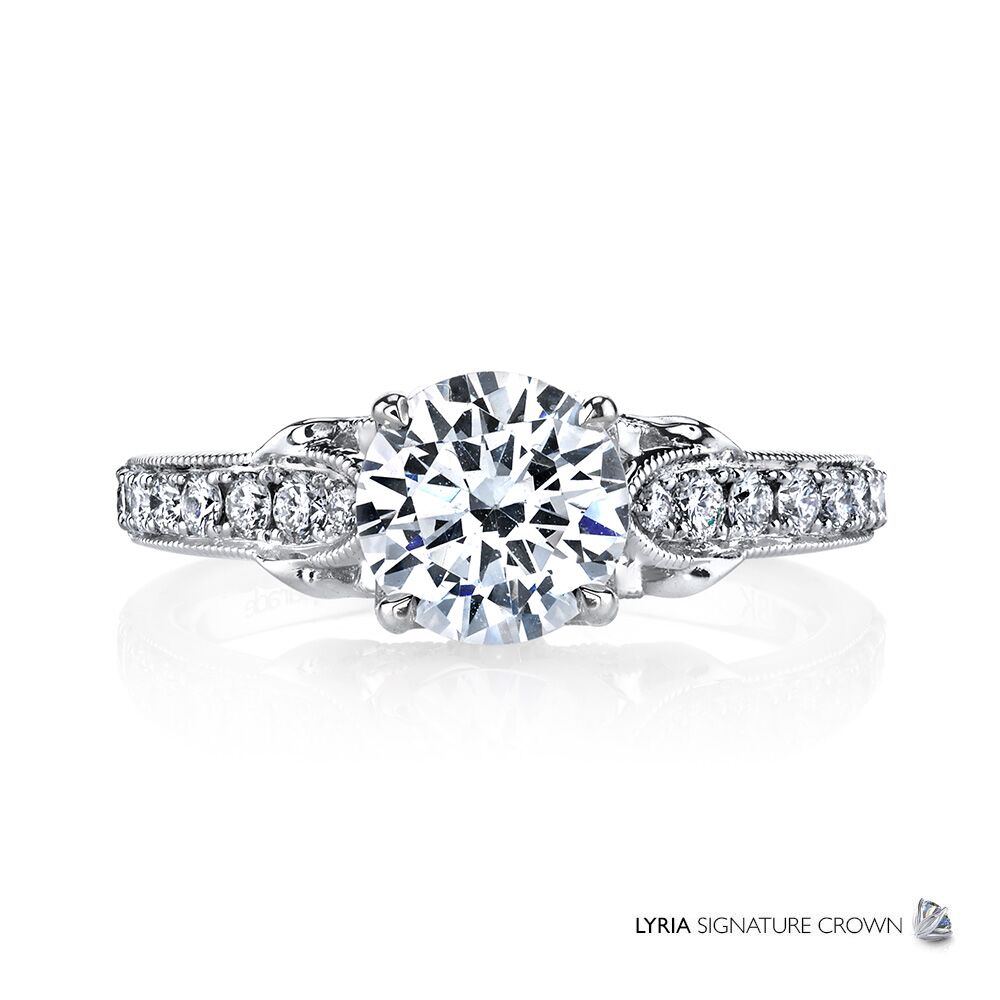 Tapered bands of sparkling white diamonds and galleries of diamond set curls finished with intricate milgrain detailing present a brilliant center stone in the LYRIA Signature Crown. Available in Platinum, as well as 18K White, Yellow or Rose Gold.