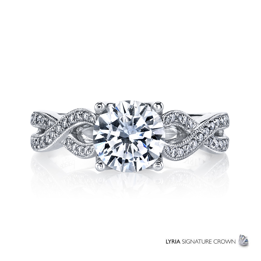 Bands of sparkling white diamonds split and cross towards the LYRIA Signature Crown presenting a brilliant center stone, in this contemporary stunner from the Hemera Bridal collection. Available in Platinum, as well as 18K White, Yellow or Rose Gold.