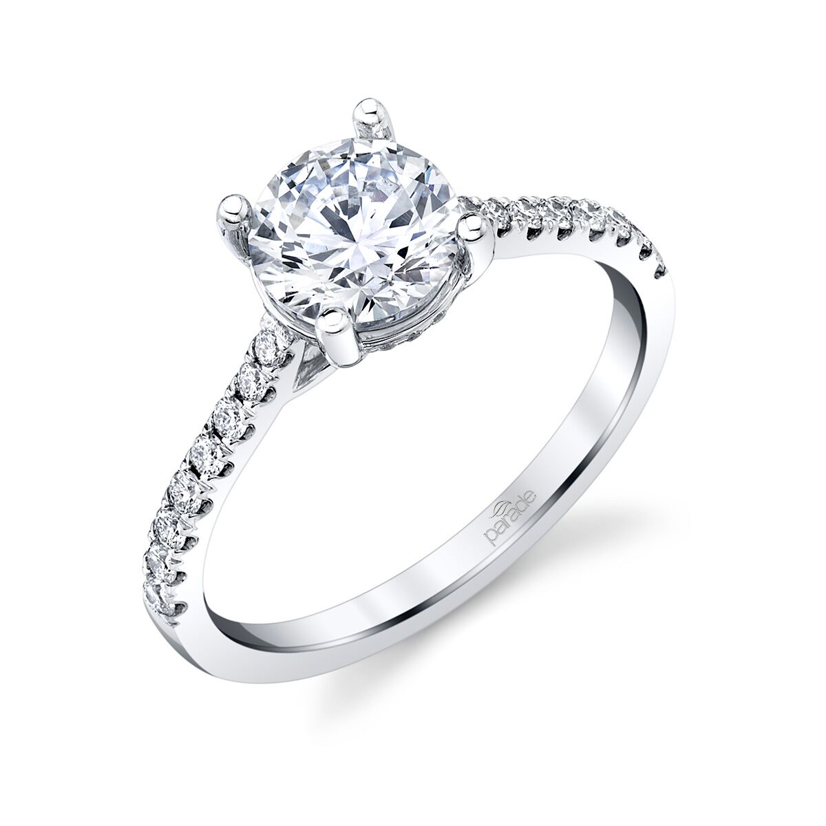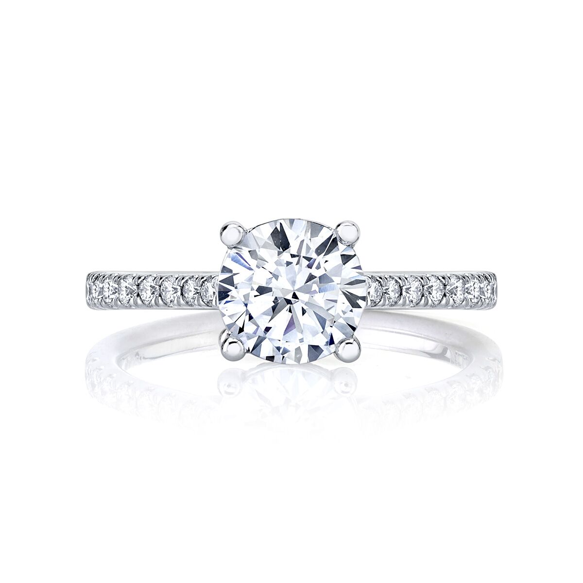 A classic engagement ring feature a straight diamond band with a diamond trellis profile. Available in Platinum, as well as 18K White, Yellow or Rose Gold.