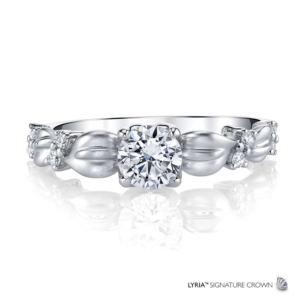 Sparkling white diamonds scattered along satin finished Lyria Leaves of 18K gold climb towards a brilliant center stone set in the Signature Lyria Crown. Available in Platinum, as well as 18K White, Yellow or Rose Gold.