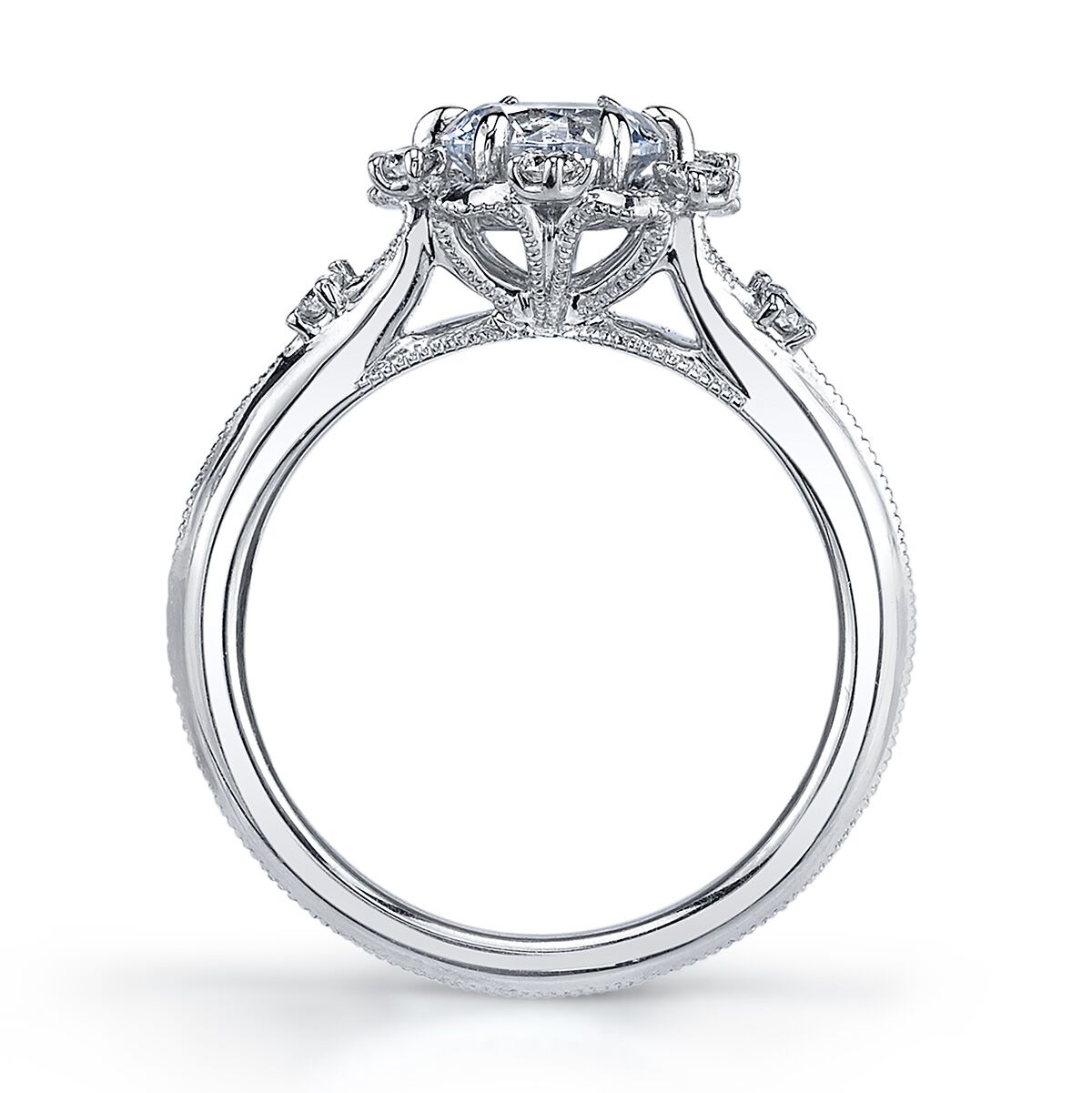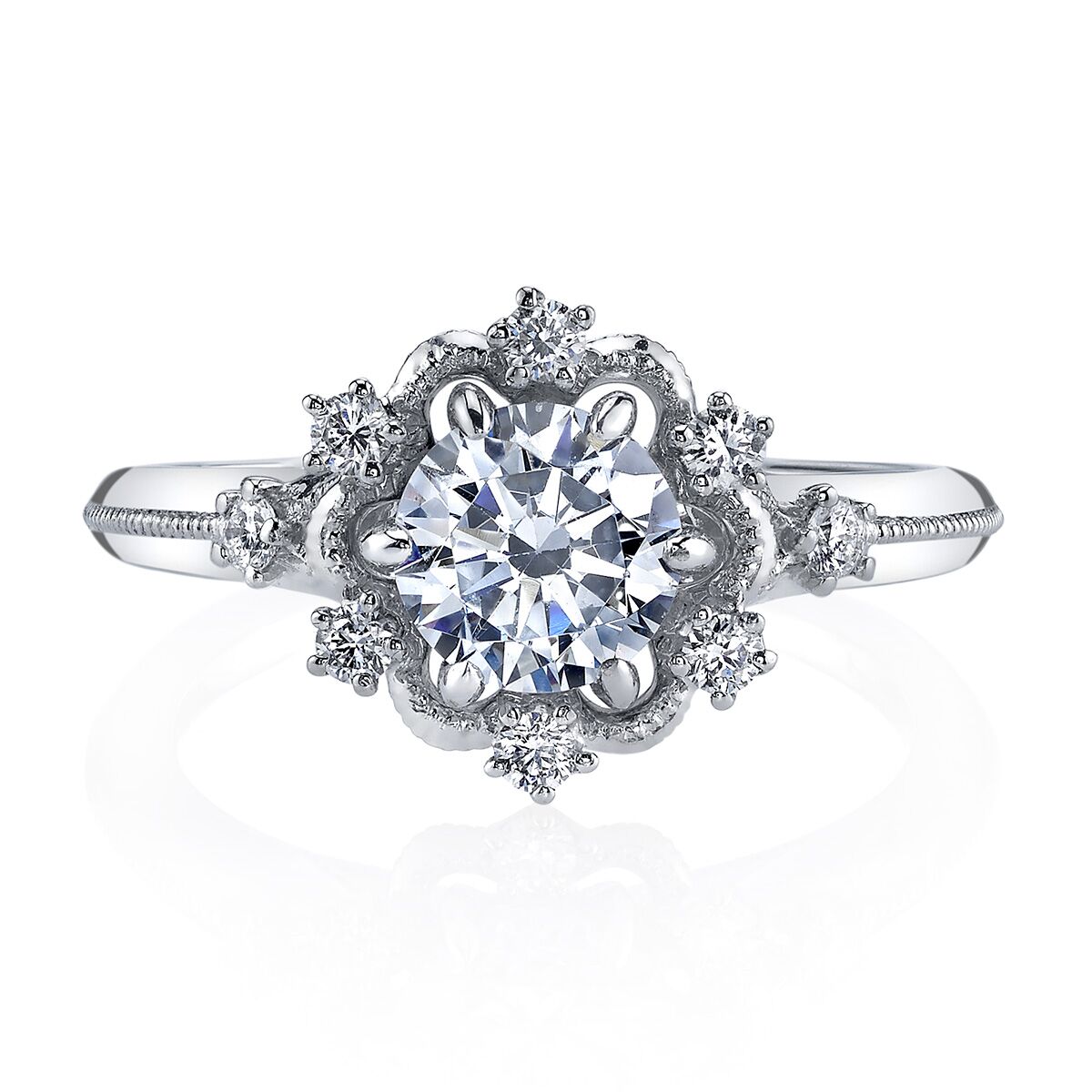 Scattered brilliant diamonds set in an open halo, and finished with intricate milgrain detailing create this stunning vintage inspired design from the Hera Bridal collection. Available in Platinum, as well as 18K White, Yellow or Rose Gold.