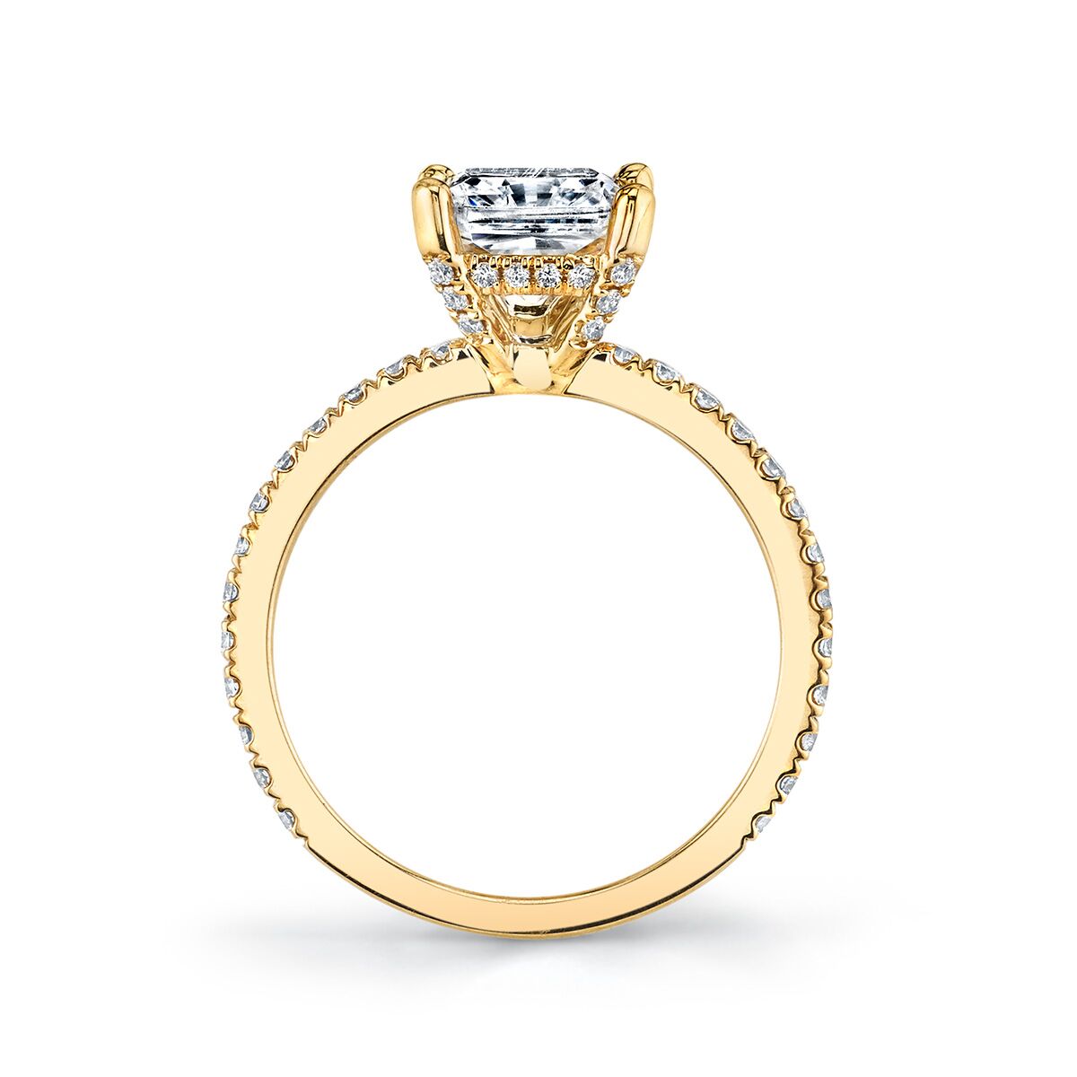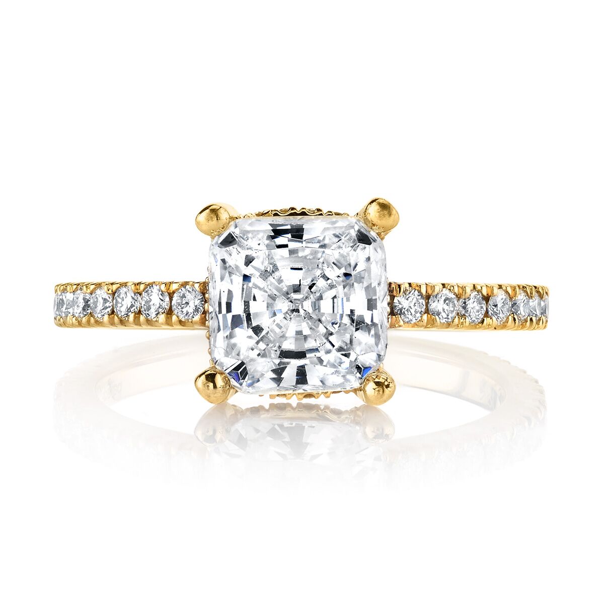 Stunning from every angle, brilliant diamonds surround a cushion center diamond in this classic setting. Available in Platinum, as well as 18K White, Yellow or Rose Gold.