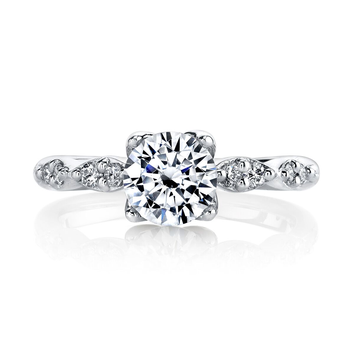 Clean and modern, a geometric band of brilliant white diamonds set in gleaming 18k gold highlight a round center stone set in the Lyria Signature Crown to perfection. Available in Platinum, as well as 18K White, Yellow or Rose Gold.