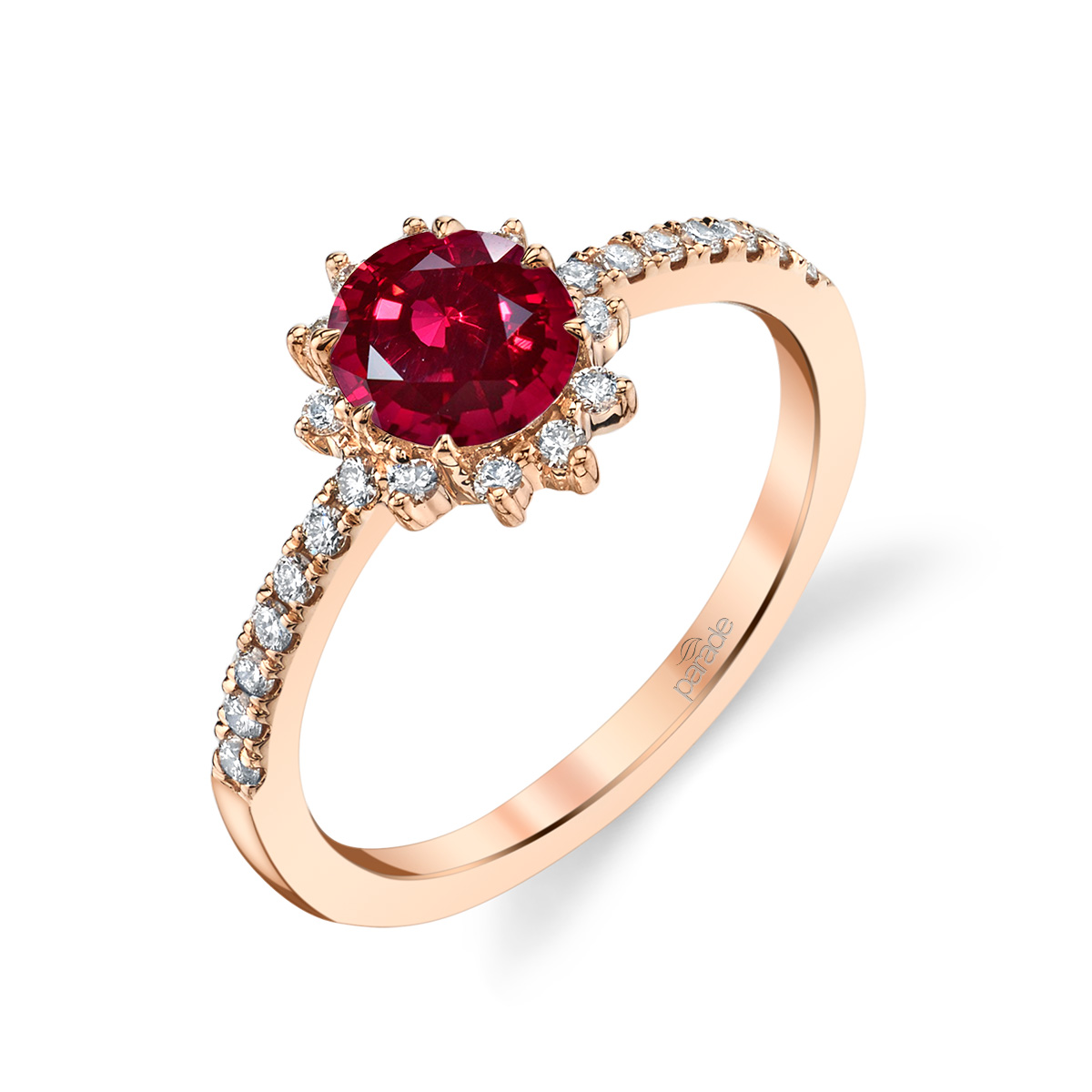 Elegance meets passion in this classic Ruby & Diamond Halo Ring. Available in Platinum, as well as 18K White, Yellow or Rose Gold.