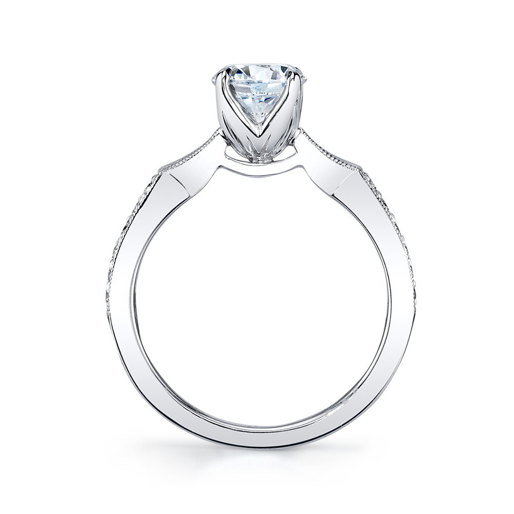 An elegant milgrain etched band of diamonds and sleek high polished gold tapers towards a brilliant center stone set in the LYRIA SIGNATURE CROWN. Available in Platinum, as well as 18K White, Yellow or Rose Gold.