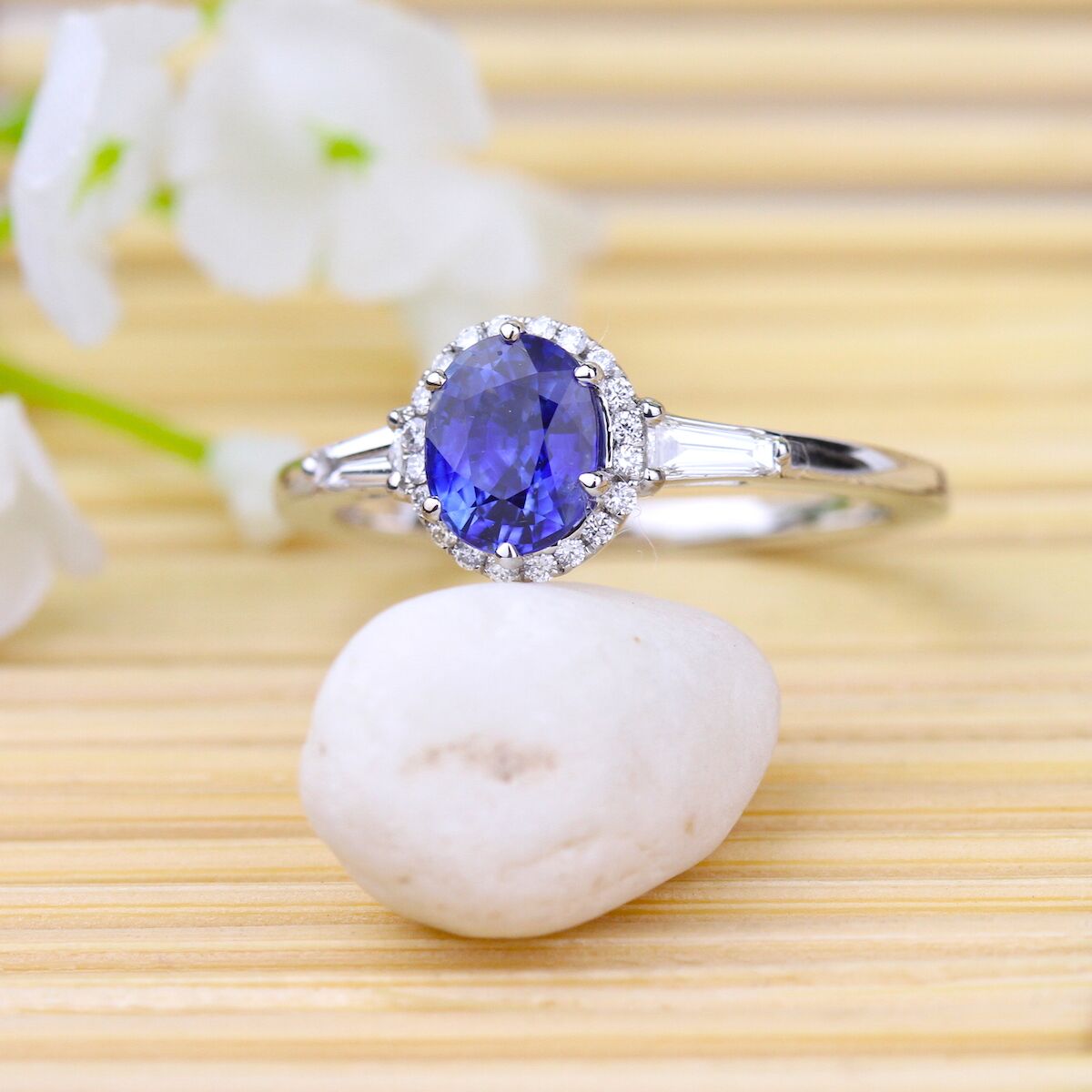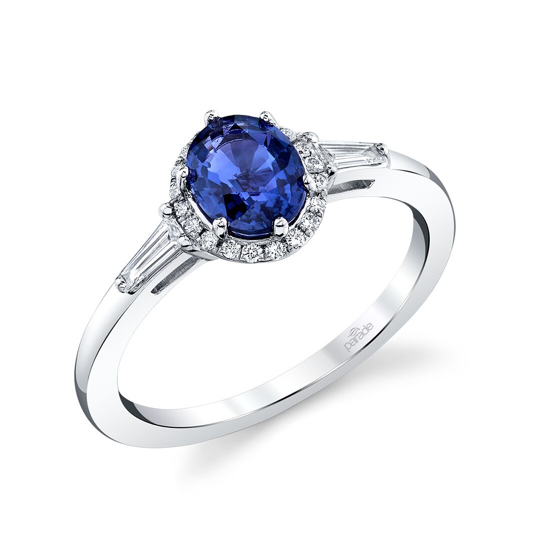 A vivid blue sapphire is at the center of this refined beauty. Clean lines and precision set baguette diamonds complement the delicate diamond halo. Available in Platinum, as well as 18K White, Yellow or Rose Gold.