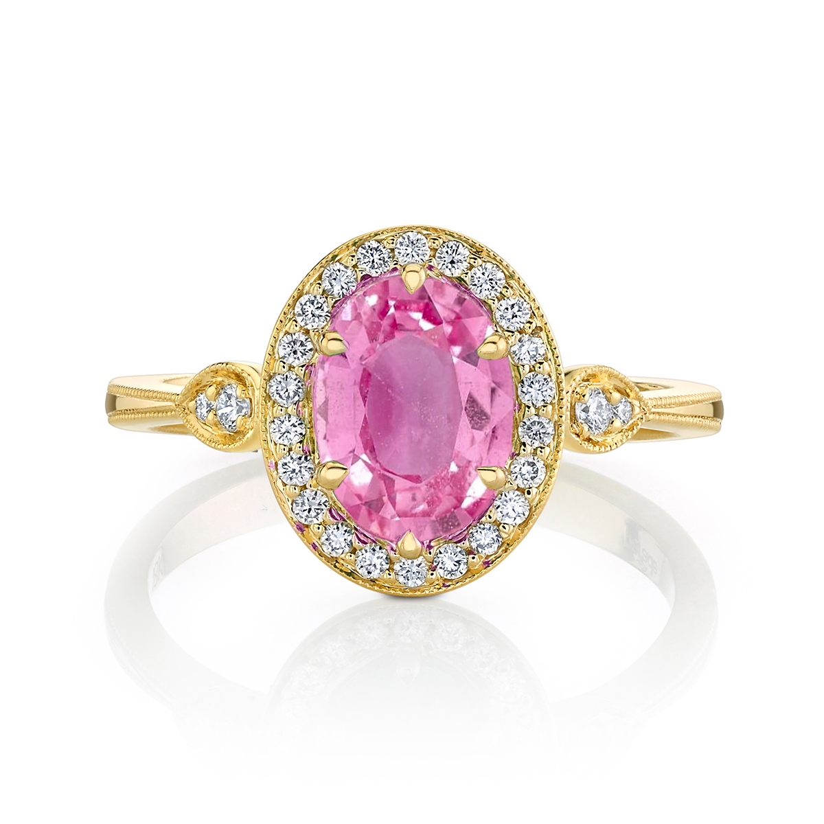 From the Parade in Color Collection, a vivid 8×6 Pink sapphire at its centre, a gorgeous diamond halo, and a gleaming 18k yellow gold band with milgrain details, is a perfect elegant ring for any occasion. Available in Platinum, as well as 18K White, Yellow or Rose Gold.