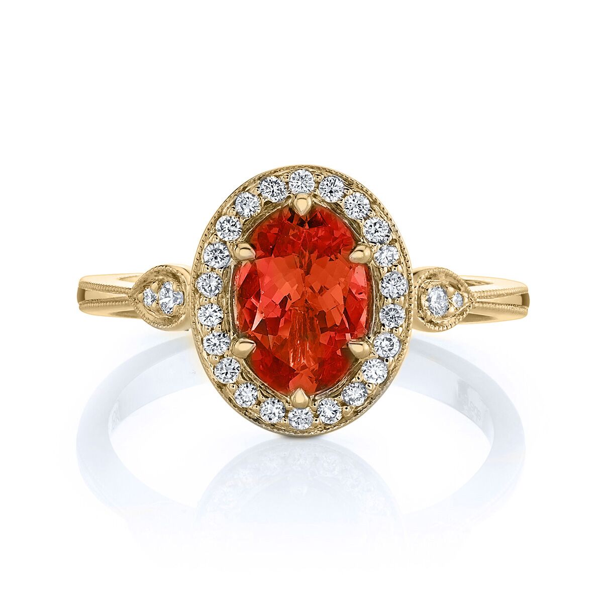 From the Parade in Color Collection, a vivid 8×6 Spessartite at its center, a gorgeous diamond halo, and a gleaming 18k yellow gold band with milgrain details, is a perfect elegant ring for any occasion. Available in Platinum, as well as 18K White, Yellow or Rose Gold.