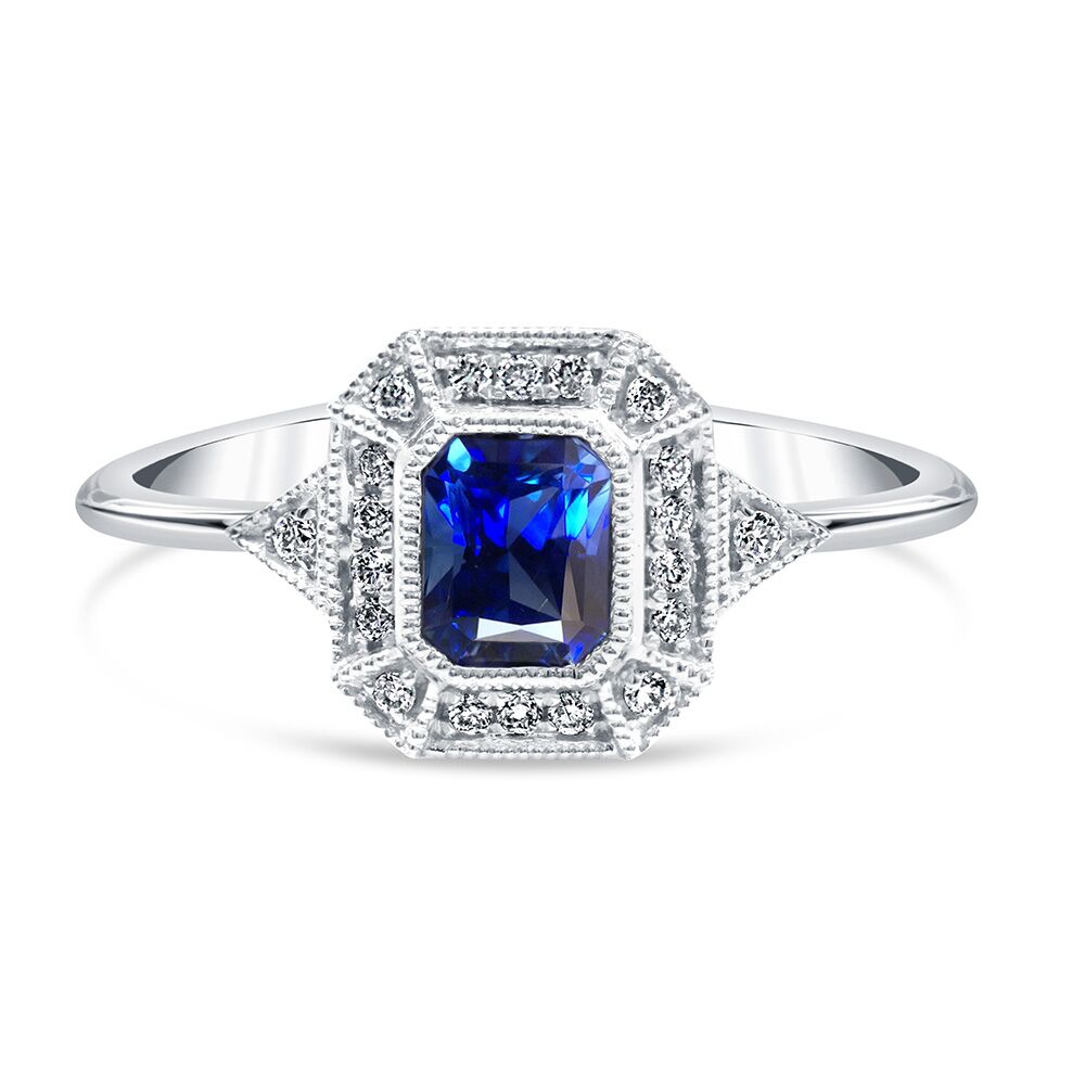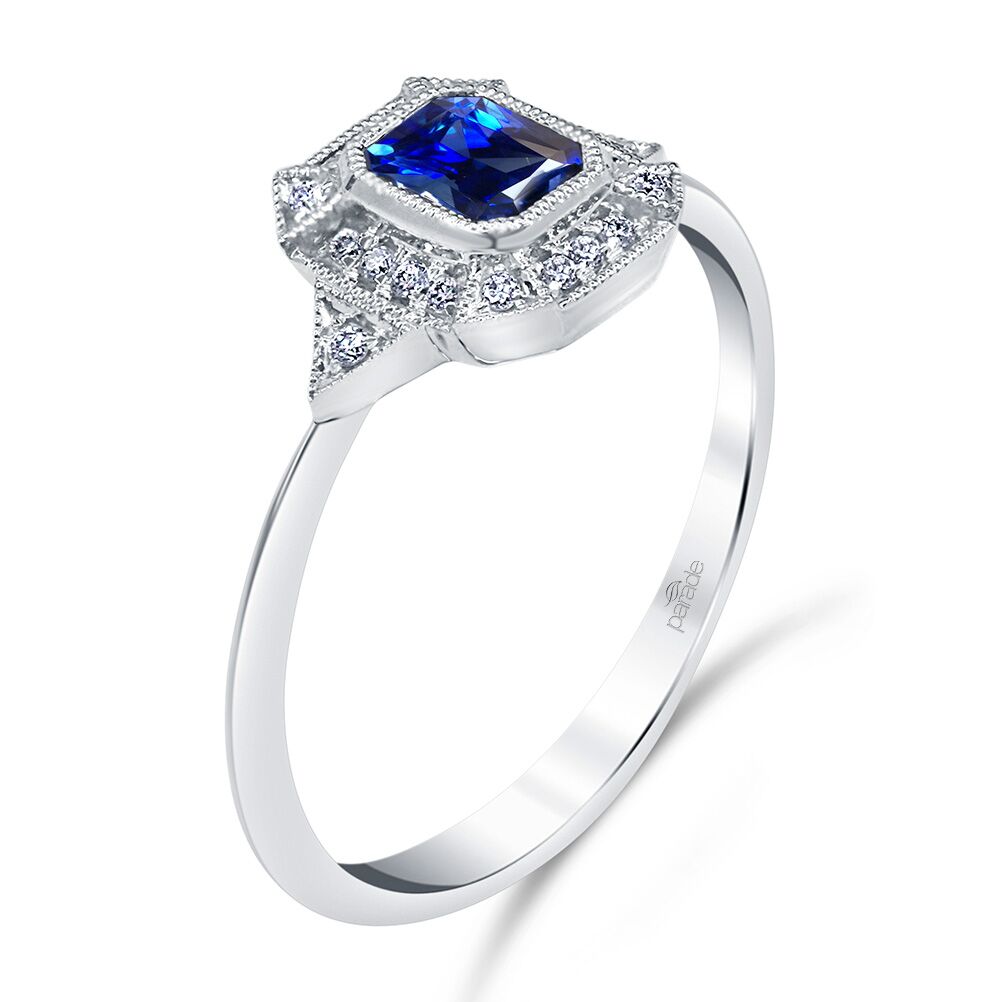 Nestled in a beautiful halo of diamonds, rests a deep blue emerald-cut sapphire, resulting in an elegant ring from the Parade in Color Collection. Available in Platinum, as well as 18K White, Yellow or Rose Gold.