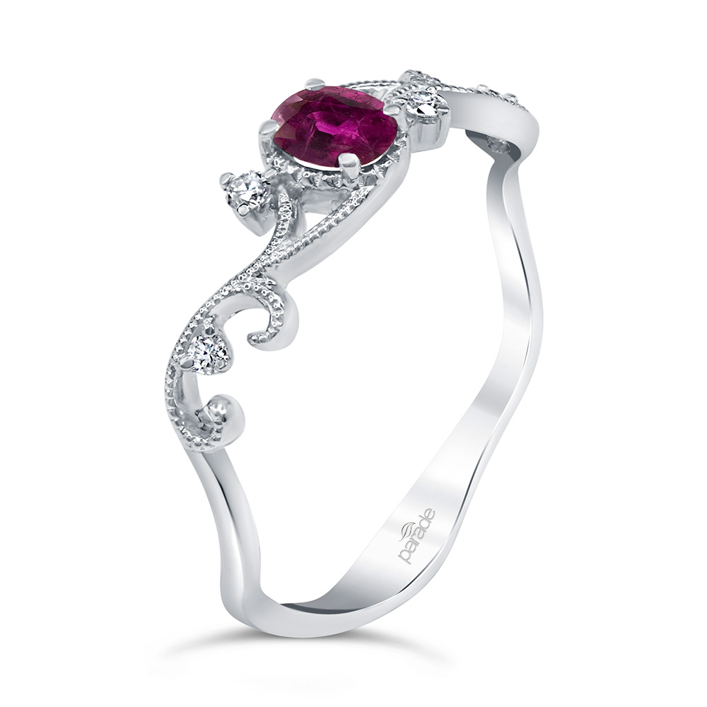 Elegant ring intertwined with nature’s delicate touch featuring a beautiful ruby. Available in Platinum, as well as 18K White, Yellow or Rose Gold.