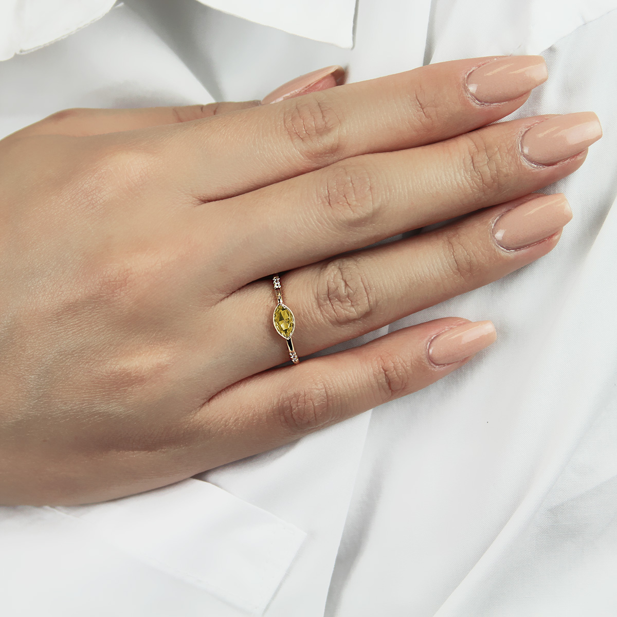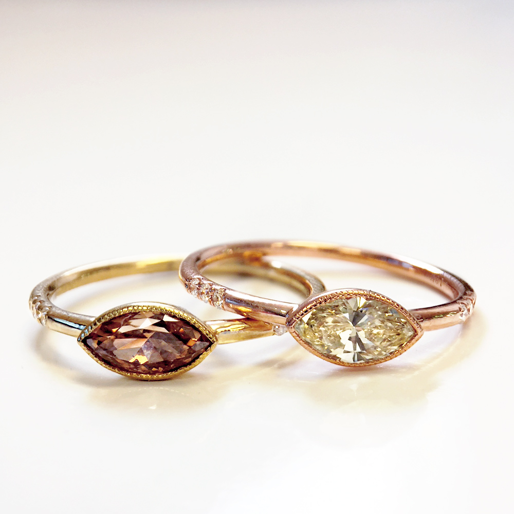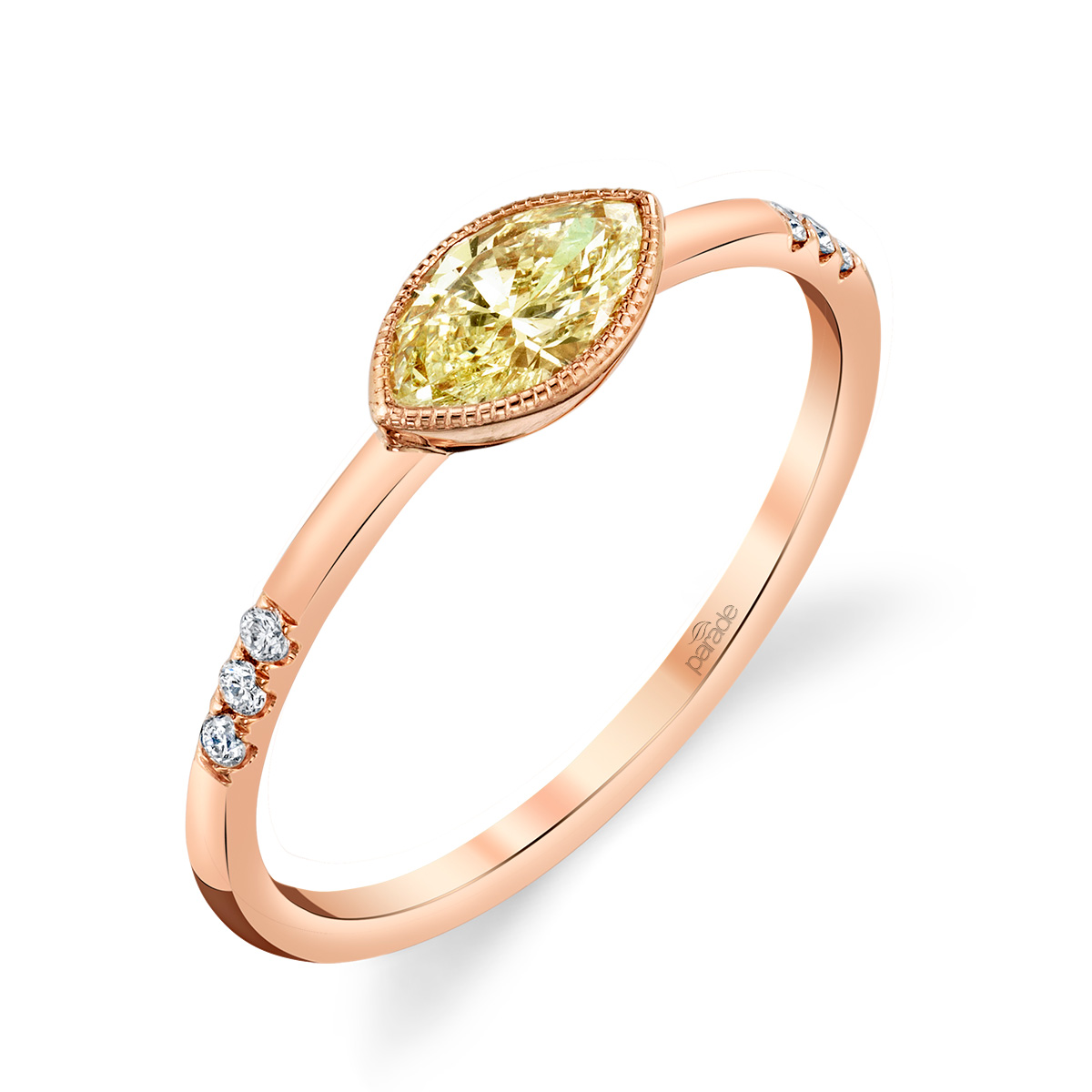 A natural fancy colored marquise diamond sits within a bezel of fine milgrained gold atop a gleaming band of 18K gold and brilliant white diamonds. Available in Platinum, as well as 18K White, Yellow or Rose Gold.