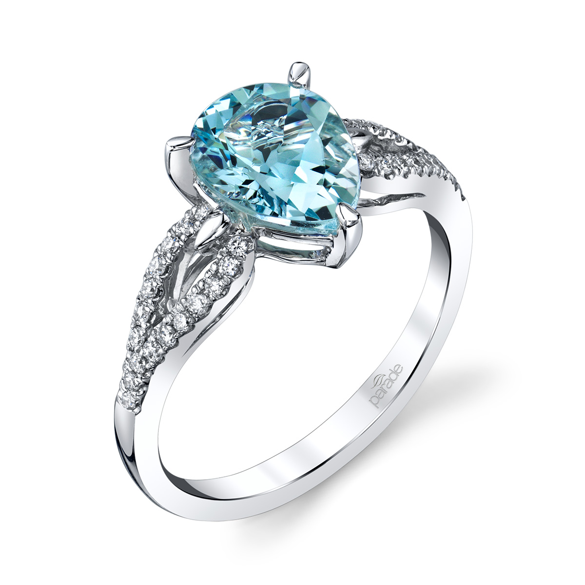 From the Parade in Color collection, a bright pear shaped blue zircon shines above a split diamond band in 18k white gold. Available in Platinum, as well as 18K White, Yellow or Rose Gold.