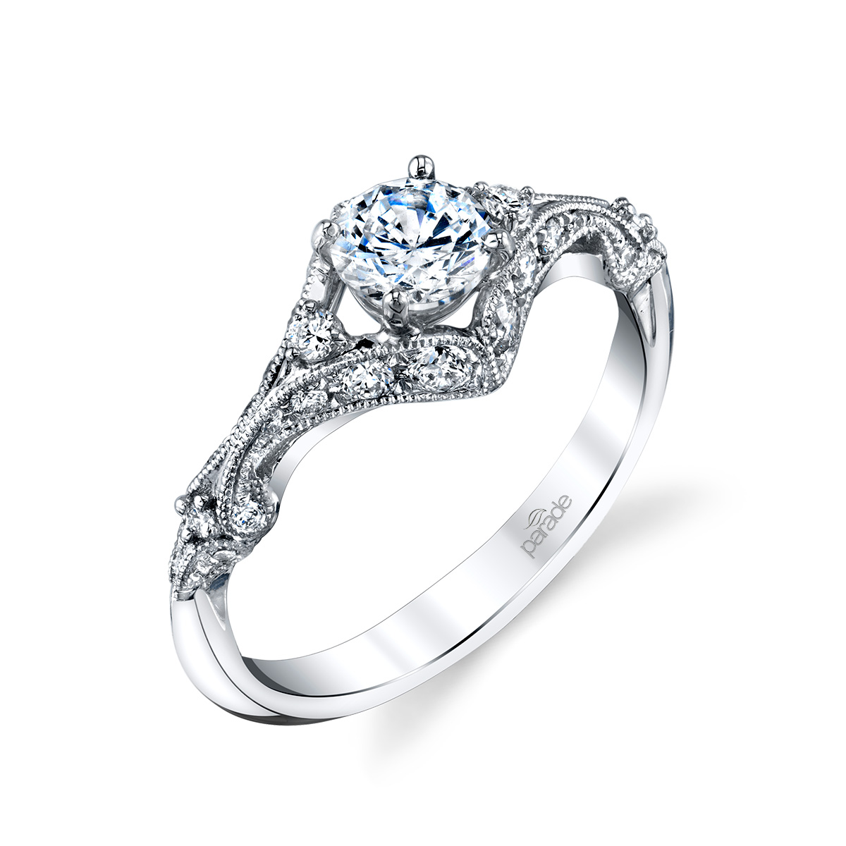 A brilliant center stone floats atop scrolling diamond set arches, finished with intricate milgrain detailing, in this stunning vintage inspired design from the Hera Bridal Collection. Available in Platinum, as well as 18K White, Yellow or Rose Gold.