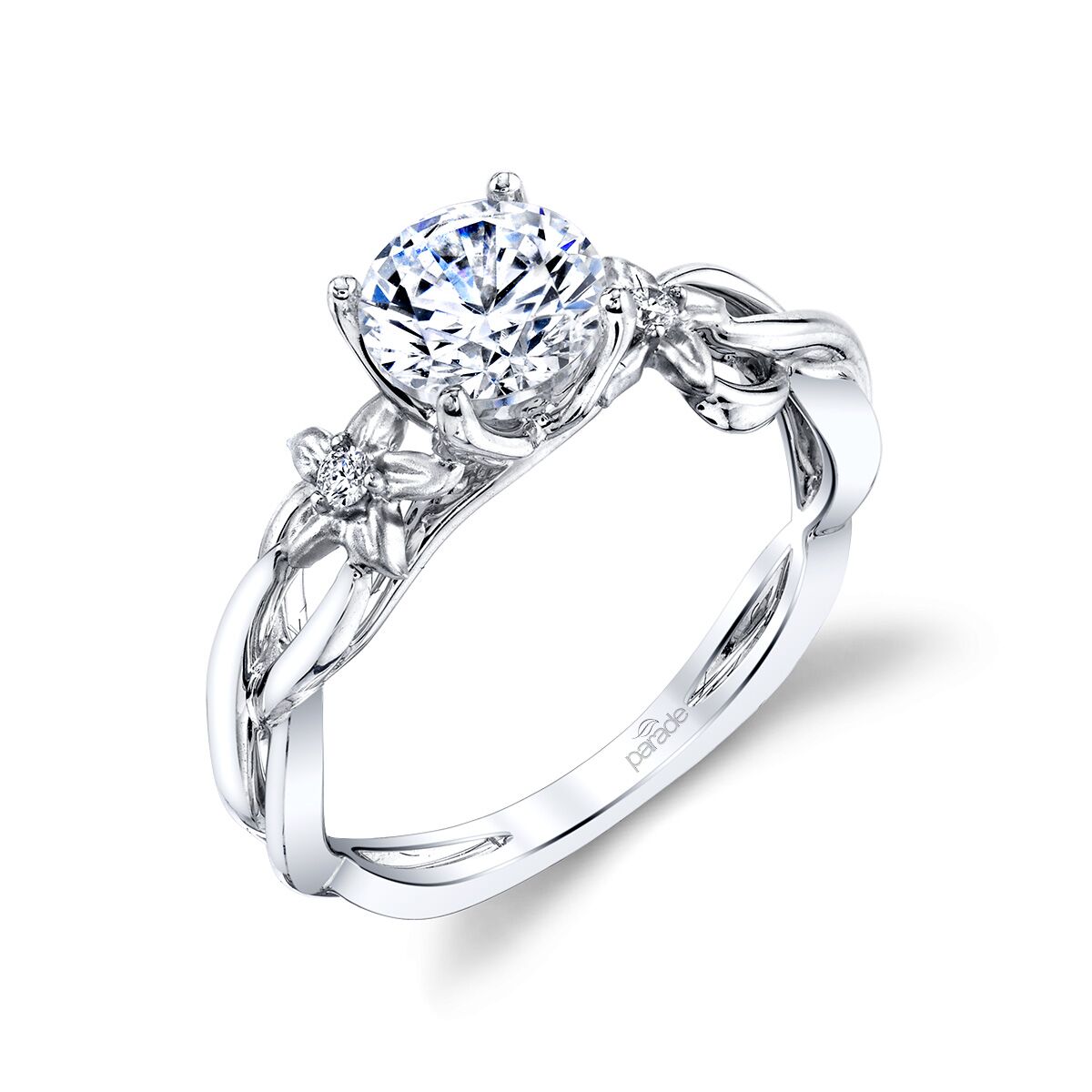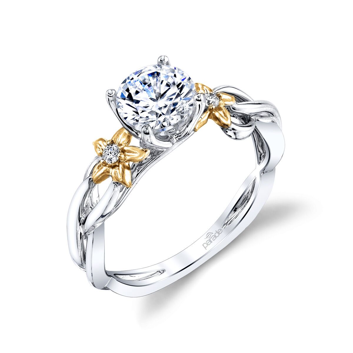 A brilliant center stone sits atop diamond accented flowers along intertwined branches of high polished 18K gold in this organic design from the Lyria Bridal collection. Available in Platinum, as well as 18K White, Yellow or Rose Gold.