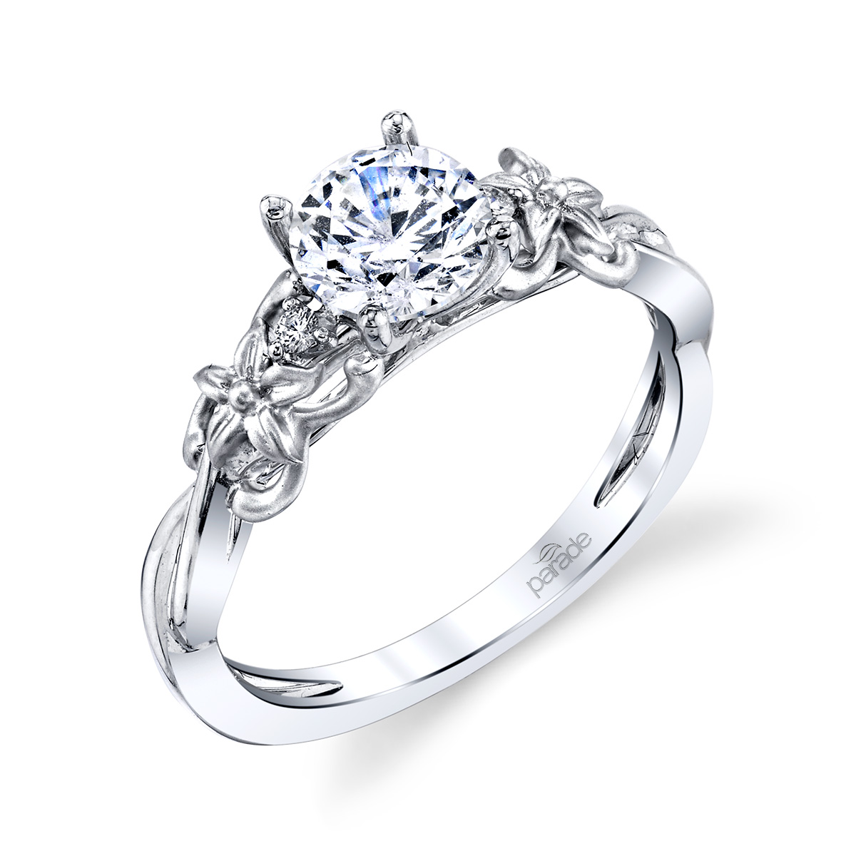 A brilliant center stone sits atop diamond accents and satin finished flowers along twisted branches of high polished 18K gold in this organic design from the Lyria Bridal collection. Available in Platinum, as well as 18K White, Yellow or Rose Gold.