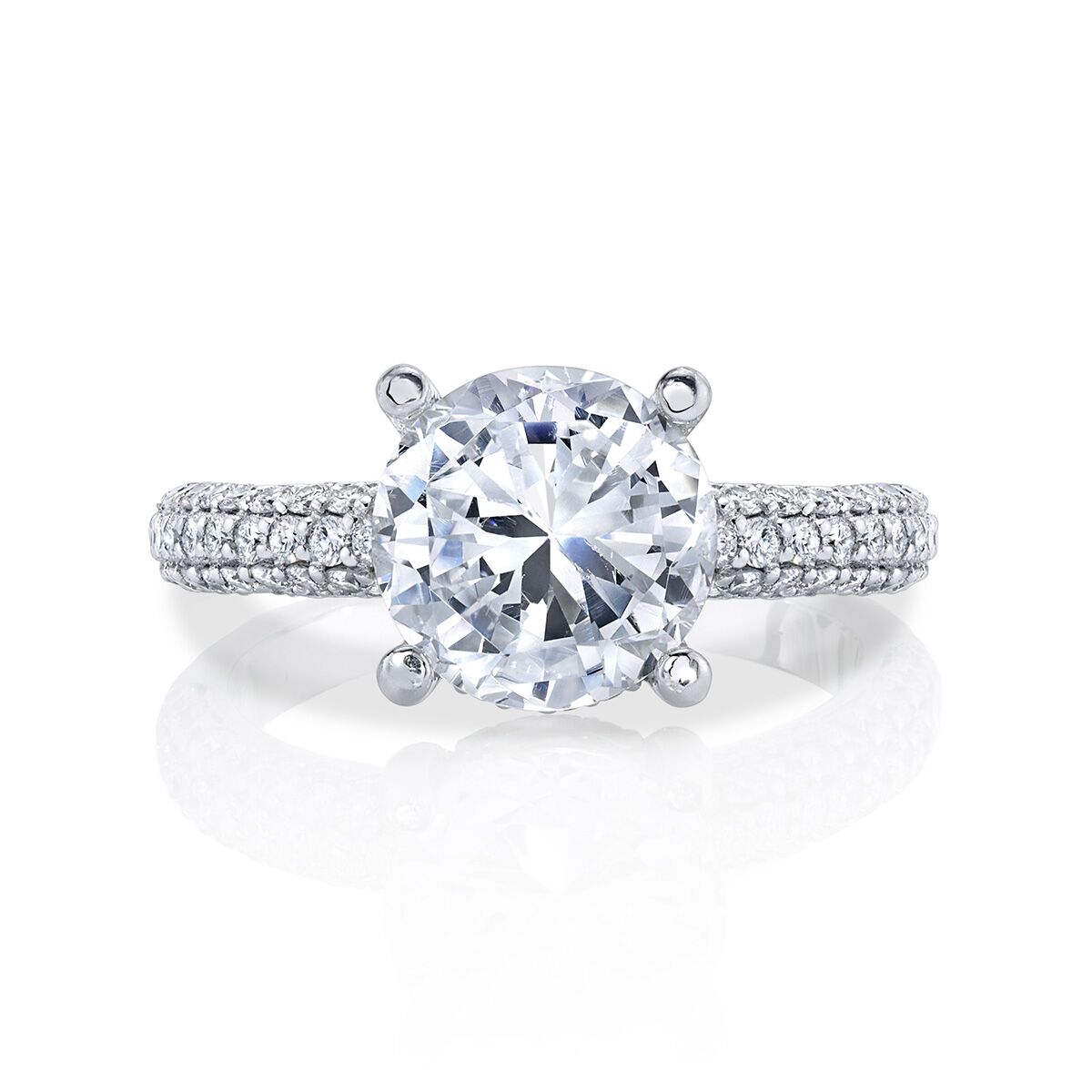 Ribbons of sparkling white diamonds on the profile add style and charm to this classic diamond engagement ring finished with a brilliant center stone. Available in Platinum, as well as 18K White, Yellow or Rose Gold.