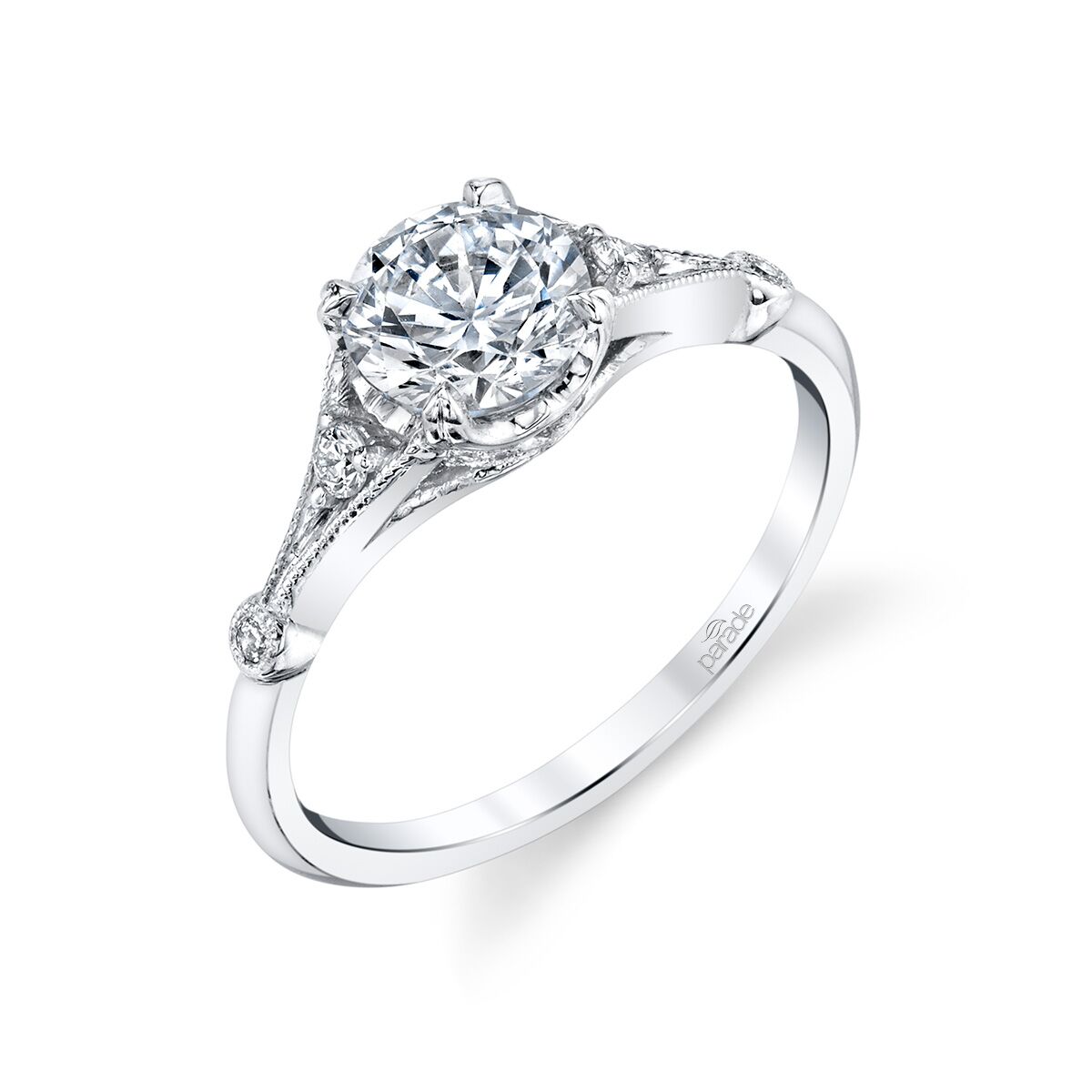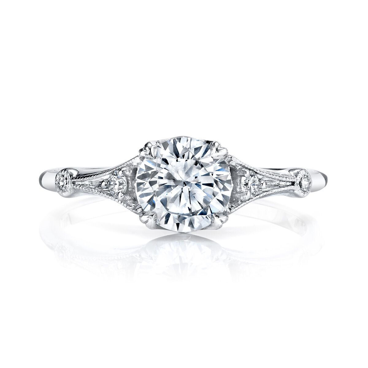 An Art Deco-inspired beauty exhibits a flush set brilliant center in four claw prongs and detailed with diamond set curved symmetrical sides and milgrain edges. Available in Platinum, as well as 18K White, Yellow or Rose Gold.