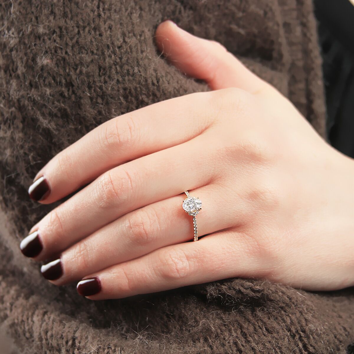 An oval brilliant center is accented with vertically set graduated diamonds on either side as well as halfway along the shank for an updated effect on a timeless piece. Available in Platinum, as well as 18K White, Yellow or Rose Gold.
