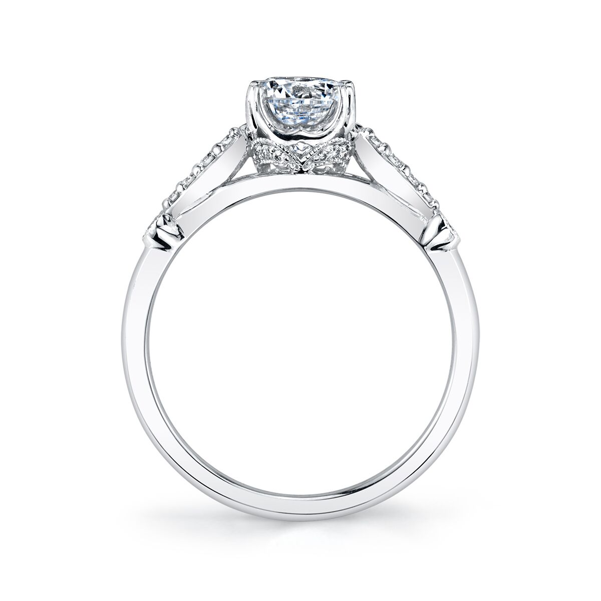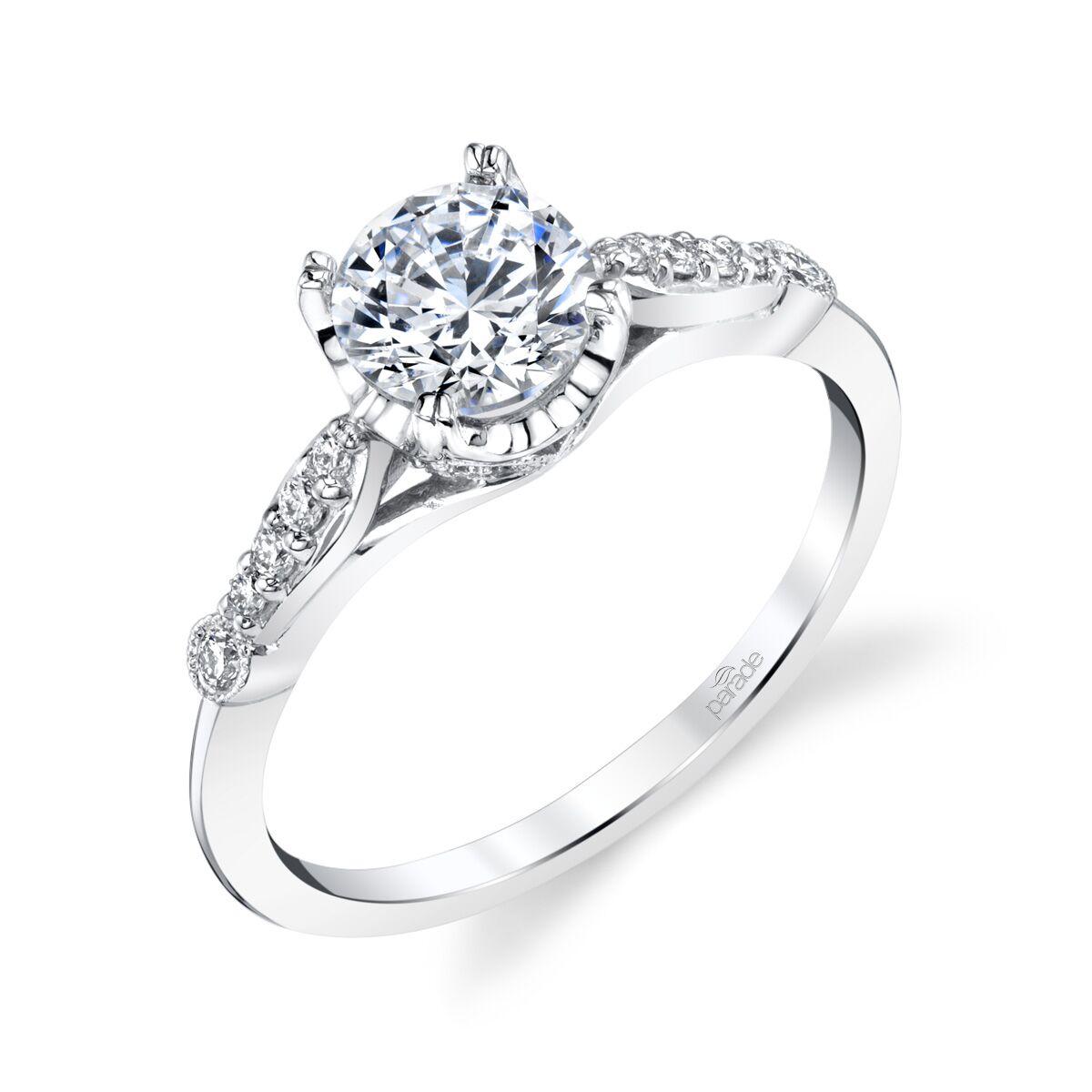 An early deco inspired classic featuring a brilliant center stone surrounding by sparkling white diamonds set along the crown and band, finished with a bezel set diamond on either end. Available in Platinum, as well as 18K White, Yellow or Rose Gold.