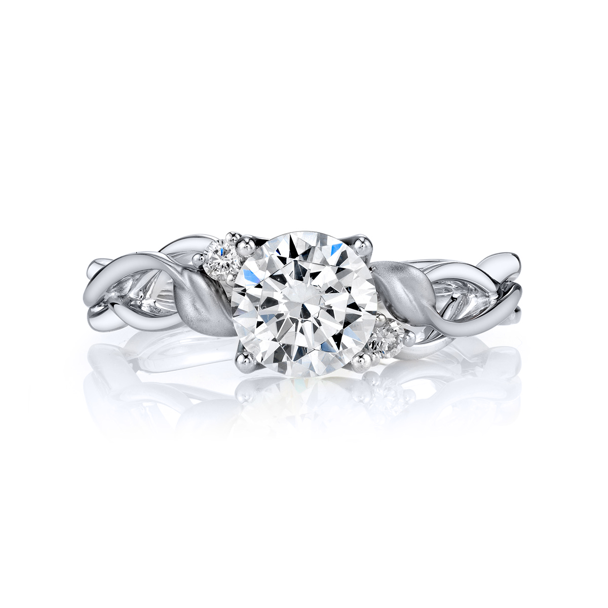 A brilliant center stone sits atop diamond accents along intertwined branches of high polished 18K gold and warm Lyria Leaves in this organic design from the Lyria Bridal collection. Available in Platinum, as well as 18K White, Yellow or Rose Gold.