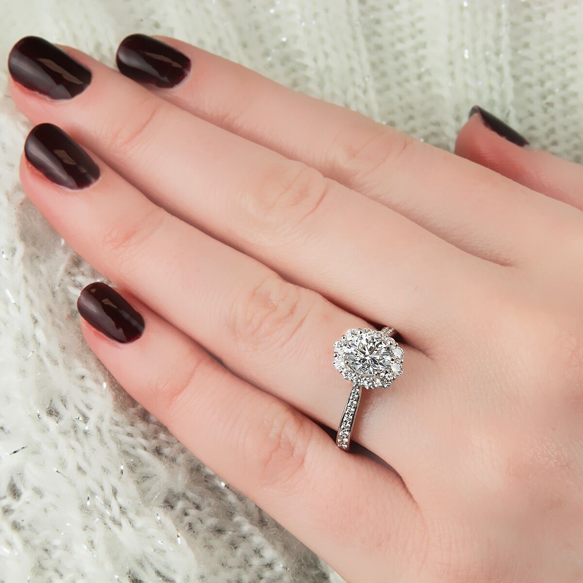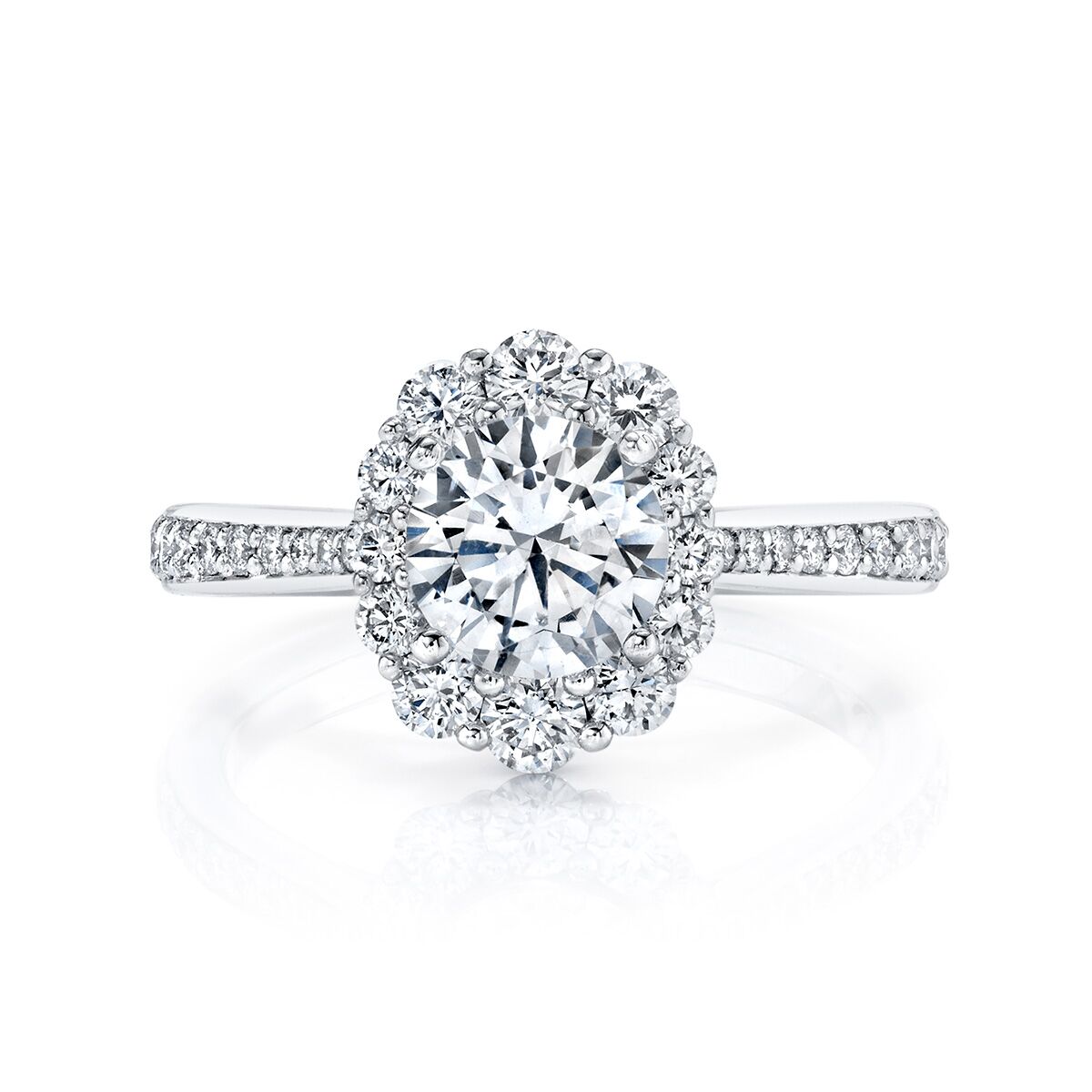 A tapered, sparkling band leads up to an elongated halo featuring graduated round brilliant diamonds that highlight a brilliant center stone. Available in Platinum, as well as 18K White, Yellow or Rose Gold.