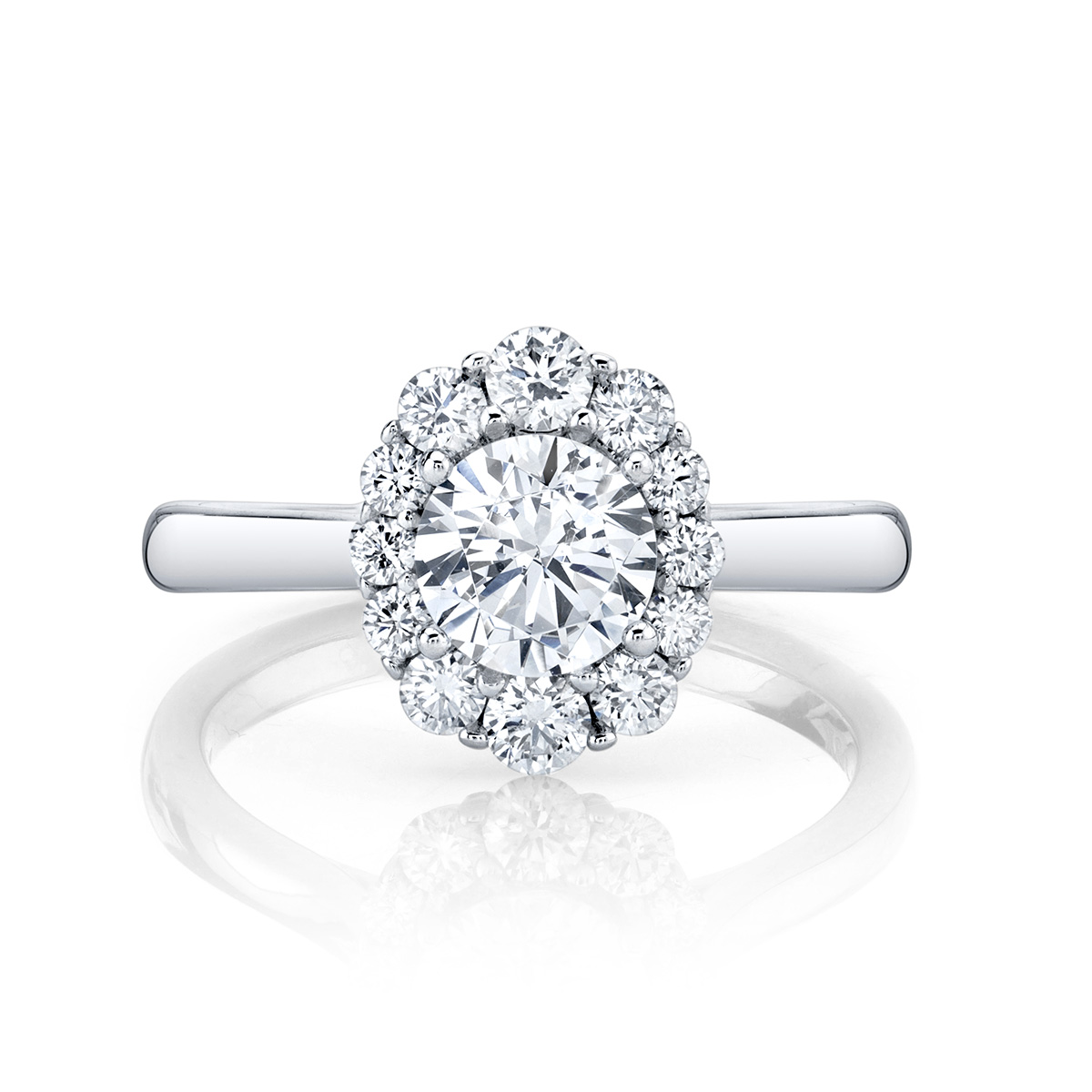 High polished band leads up to an elongated halo featuring graduated round brilliant diamonds that highlight a brilliant center stone. Available in Platinum, as well as 18K White, Yellow or Rose Gold.