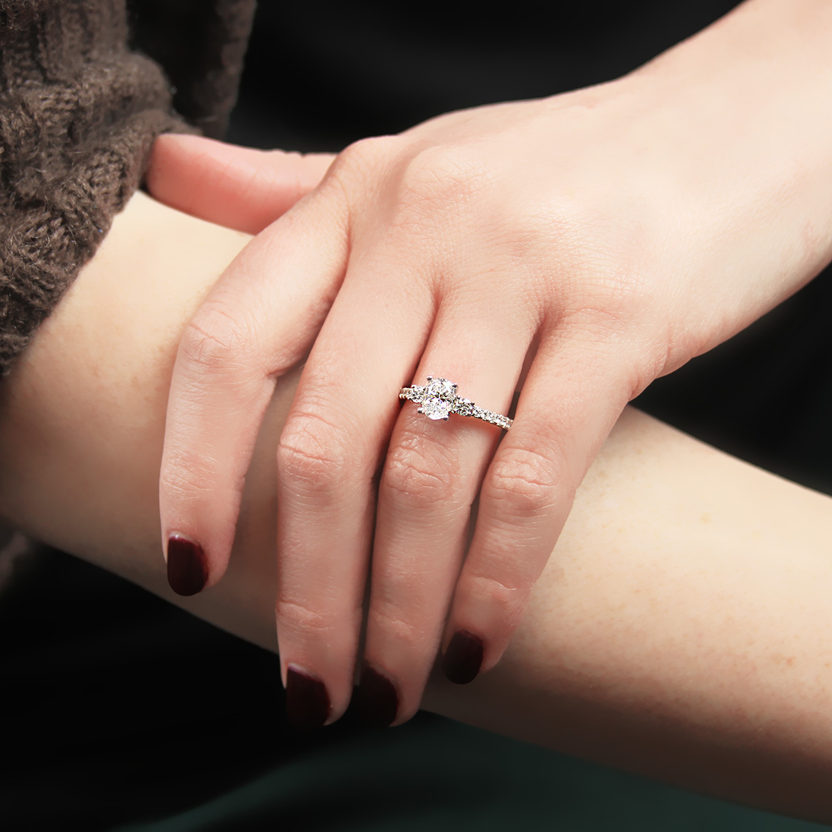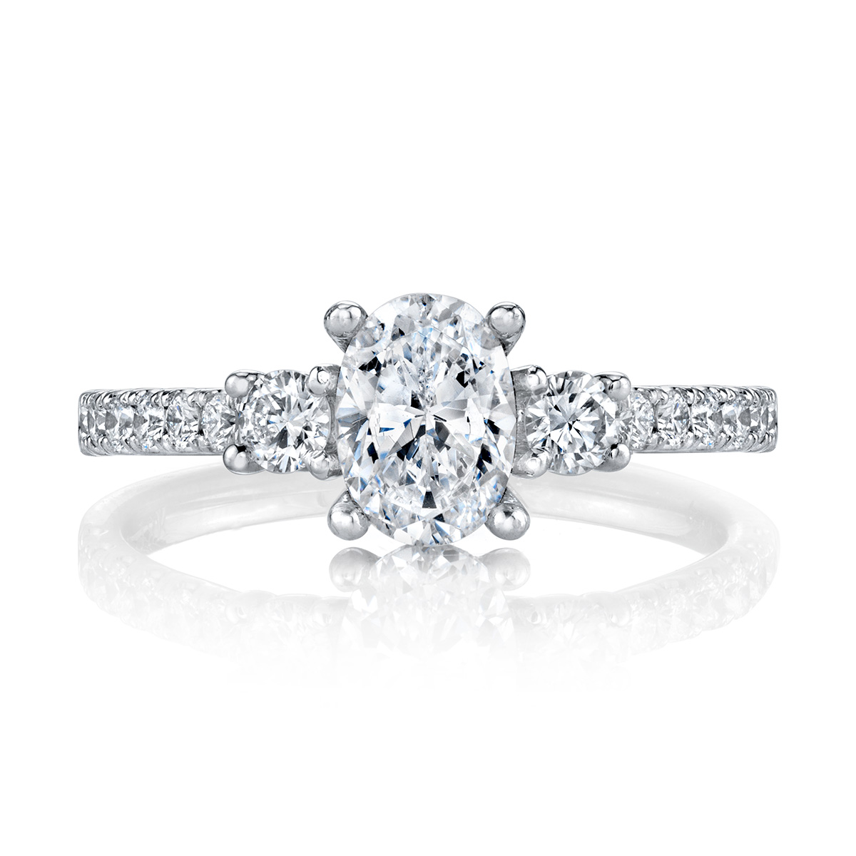 An elegant classic gets updated with a brilliant oval center set between two shimmering round side stones and a row of sparkly white diamonds. Available in Platinum, as well as 18K White, Yellow or Rose Gold.