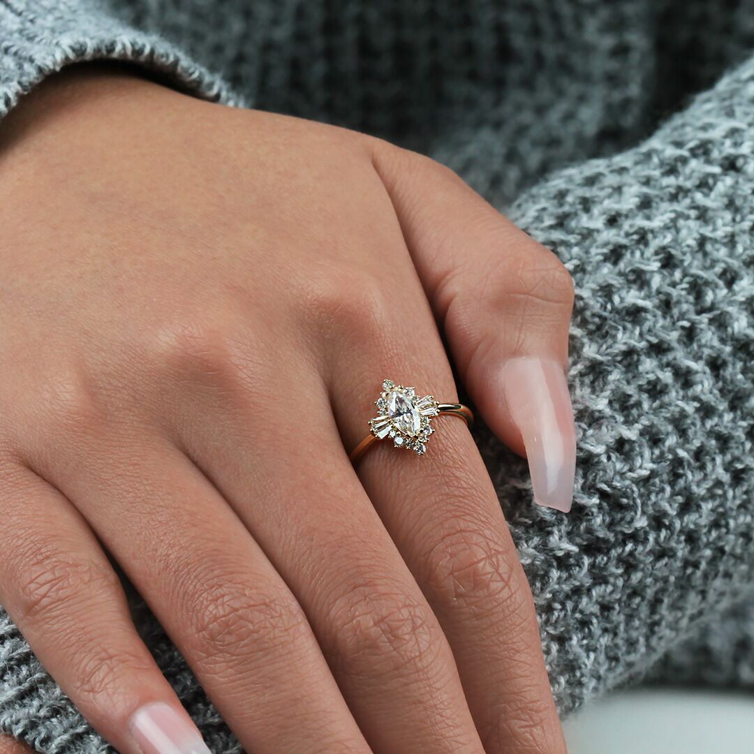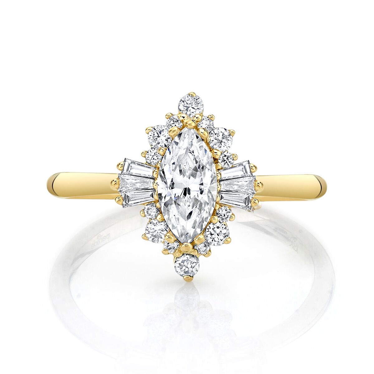 A medley of round and linear-shaped diamonds creates a romantic crown for the center marquise diamond. Available in Platinum, as well as 18K White, Yellow or Rose Gold.