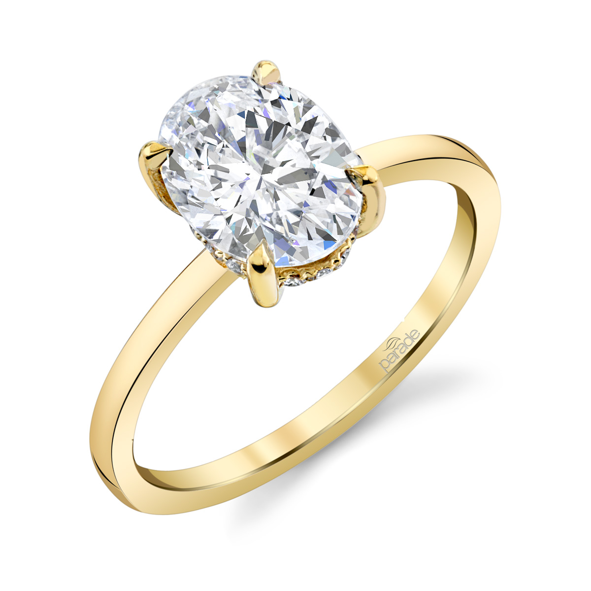 An Oval brilliant center diamond is cradled by a diamond accented basket and lifted above a polished band in this modern classic. Available in Platinum, as well as 18K White, Yellow or Rose Gold.
