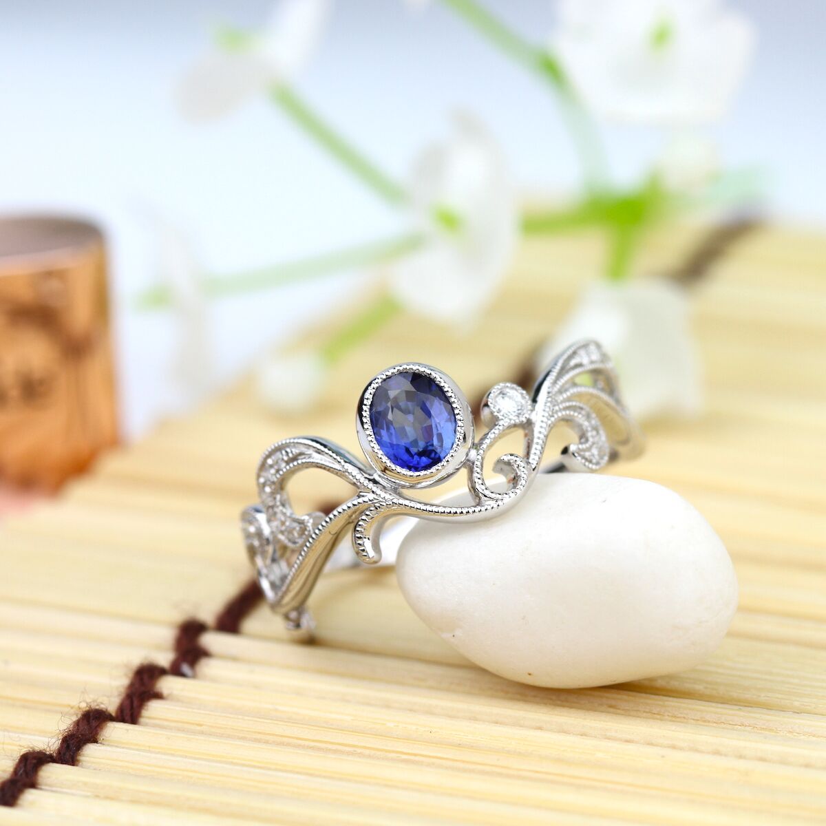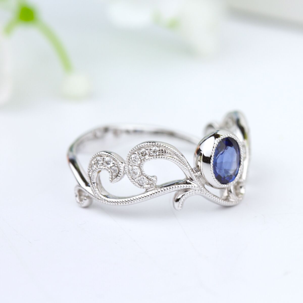 Nature Inspired Blue Sapphire Bezel Set Ring Available in Platinum, as well as 18K White, Yellow or Rose Gold.
