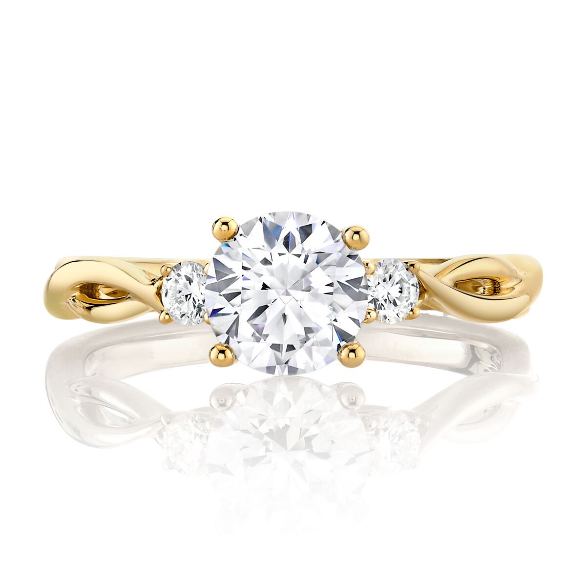 An Elegant Twist 3 Stone Diamond Ring Available in Platinum, as well as 18K White, Yellow or Rose Gold.