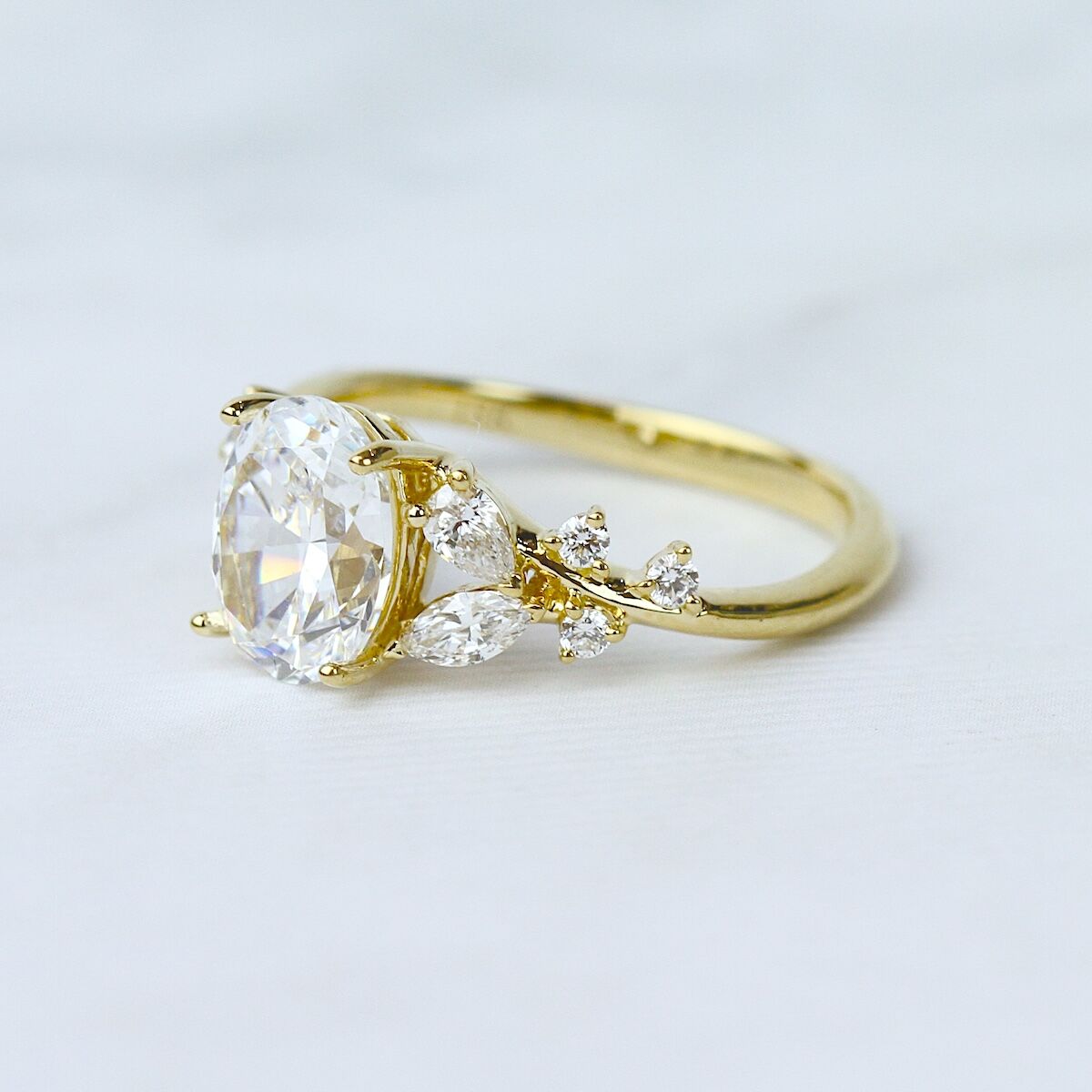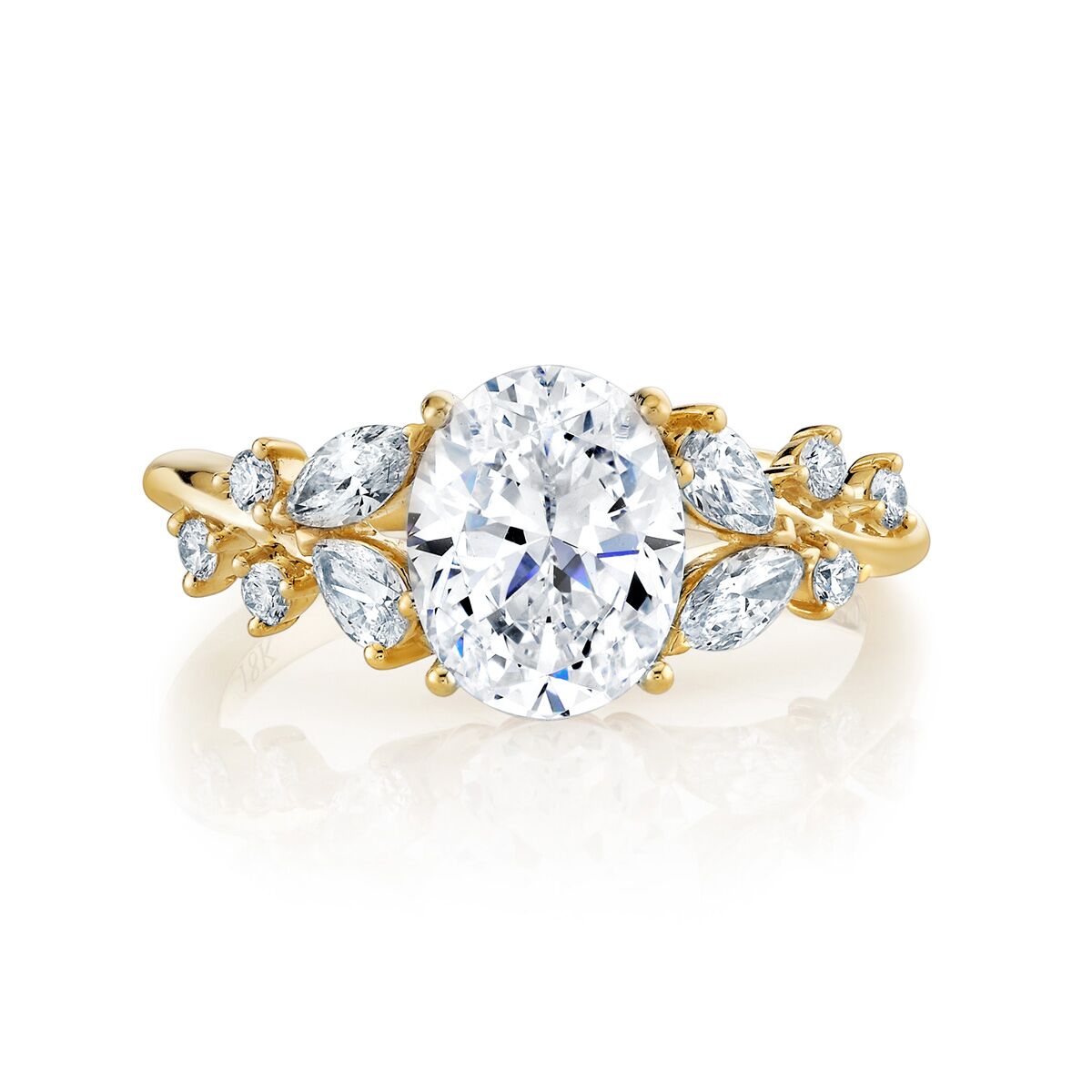 A yellow gold ring with an oval diamond center, accented by marquise, pear, and round diamonds Available in Platinum, as well as 18K White, Yellow or Rose Gold.