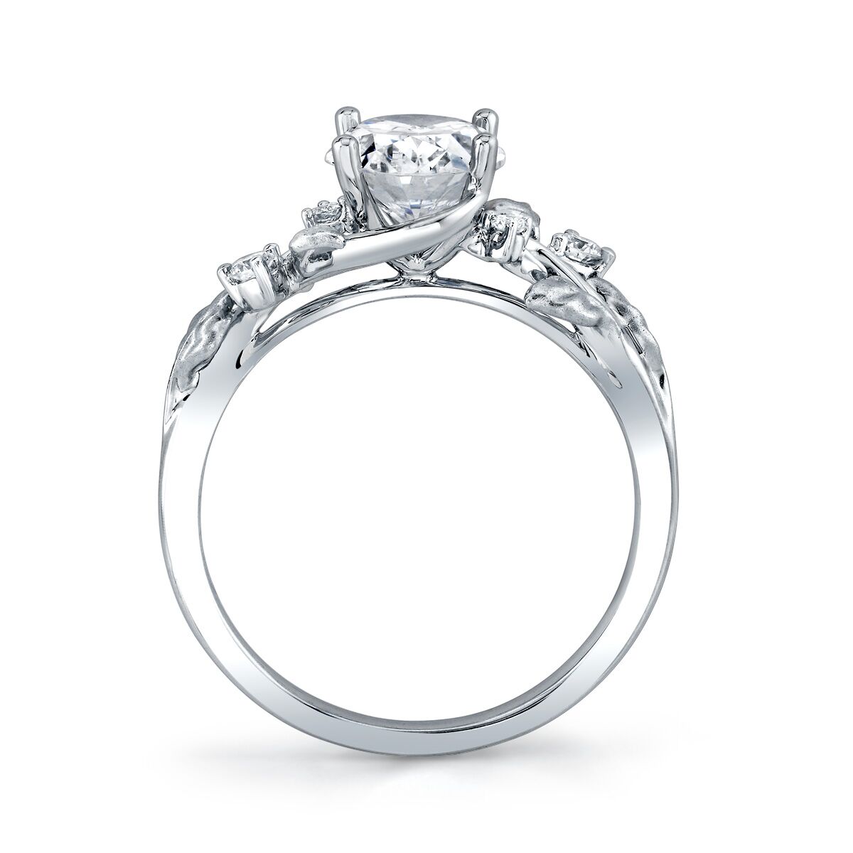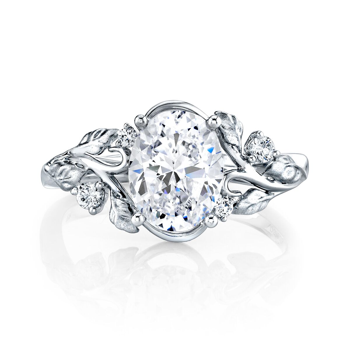 A white gold ring featuring an oval diamond center, accented by leaf-like details and small round diamonds Available in Platinum, as well as 18K White, Yellow or Rose Gold.