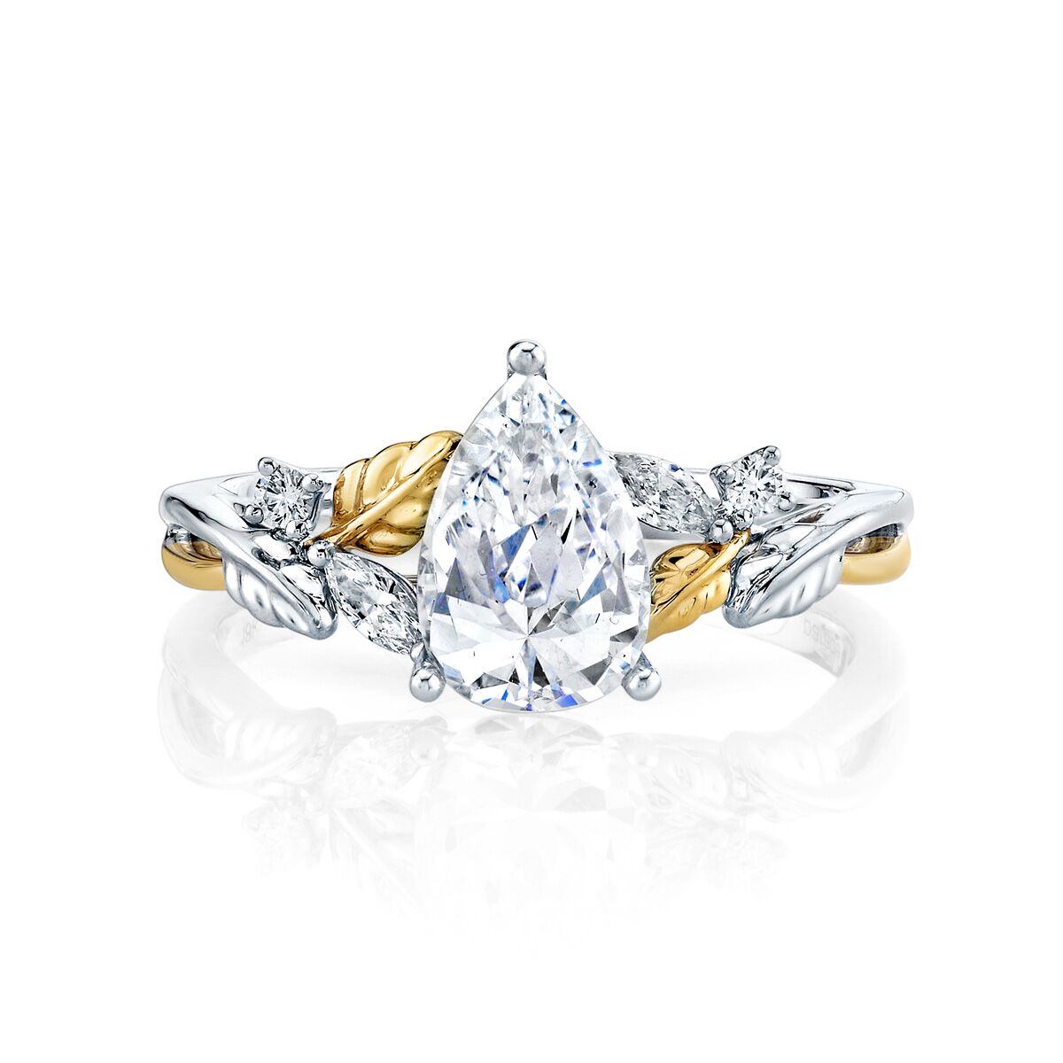 A two-tone ring featuring a pear-shaped diamond center, accented by leaf motifs and small round diamonds Available in Platinum, as well as 18K White, Yellow or Rose Gold.