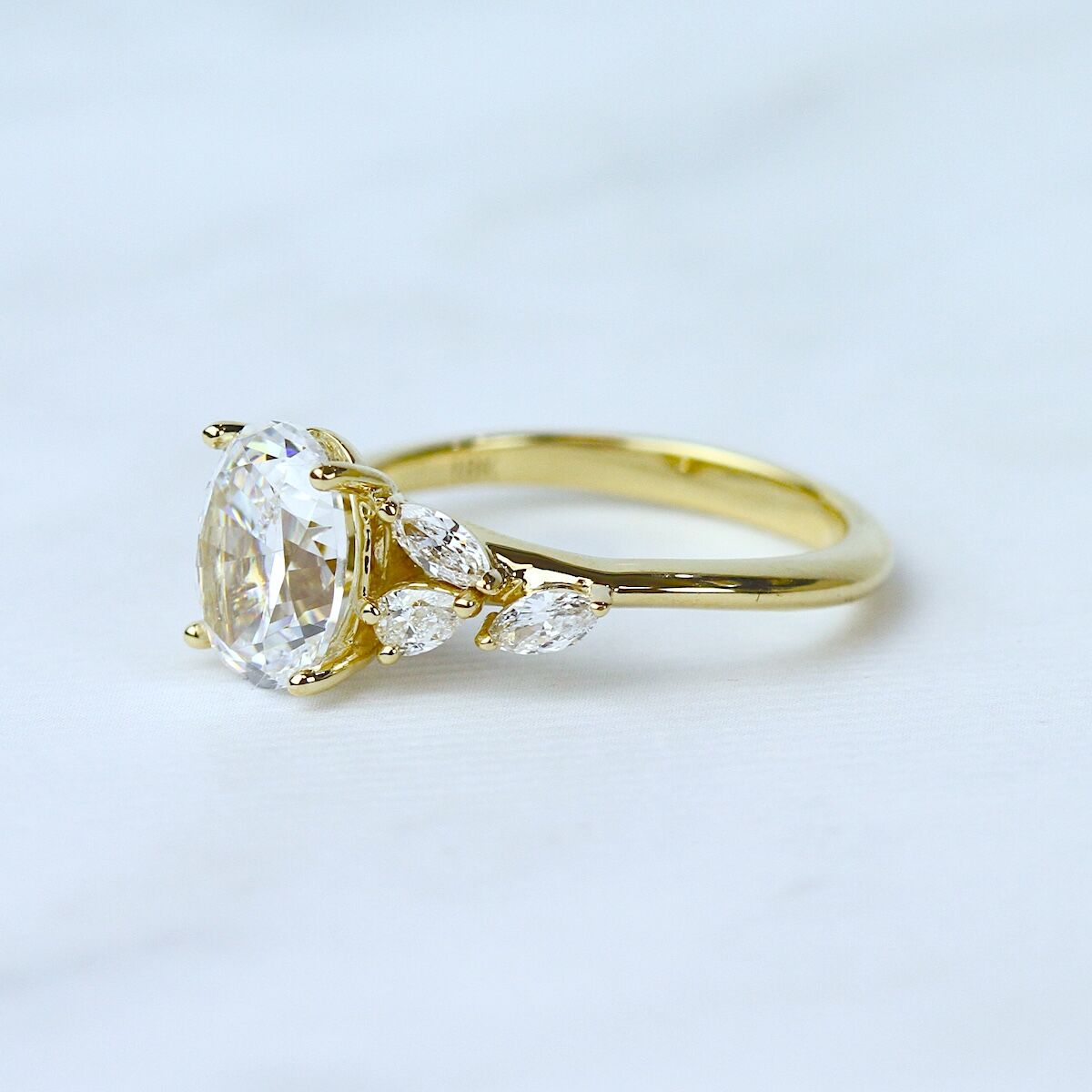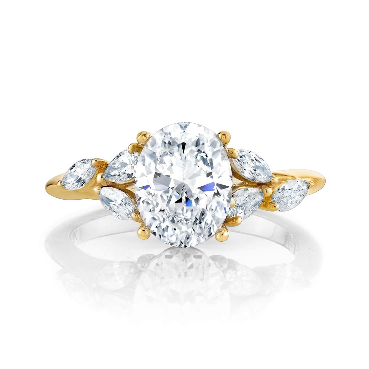 A yellow gold ring featuring an oval diamond center, flanked by marquise and round diamonds Available in Platinum, as well as 18K White, Yellow or Rose Gold.