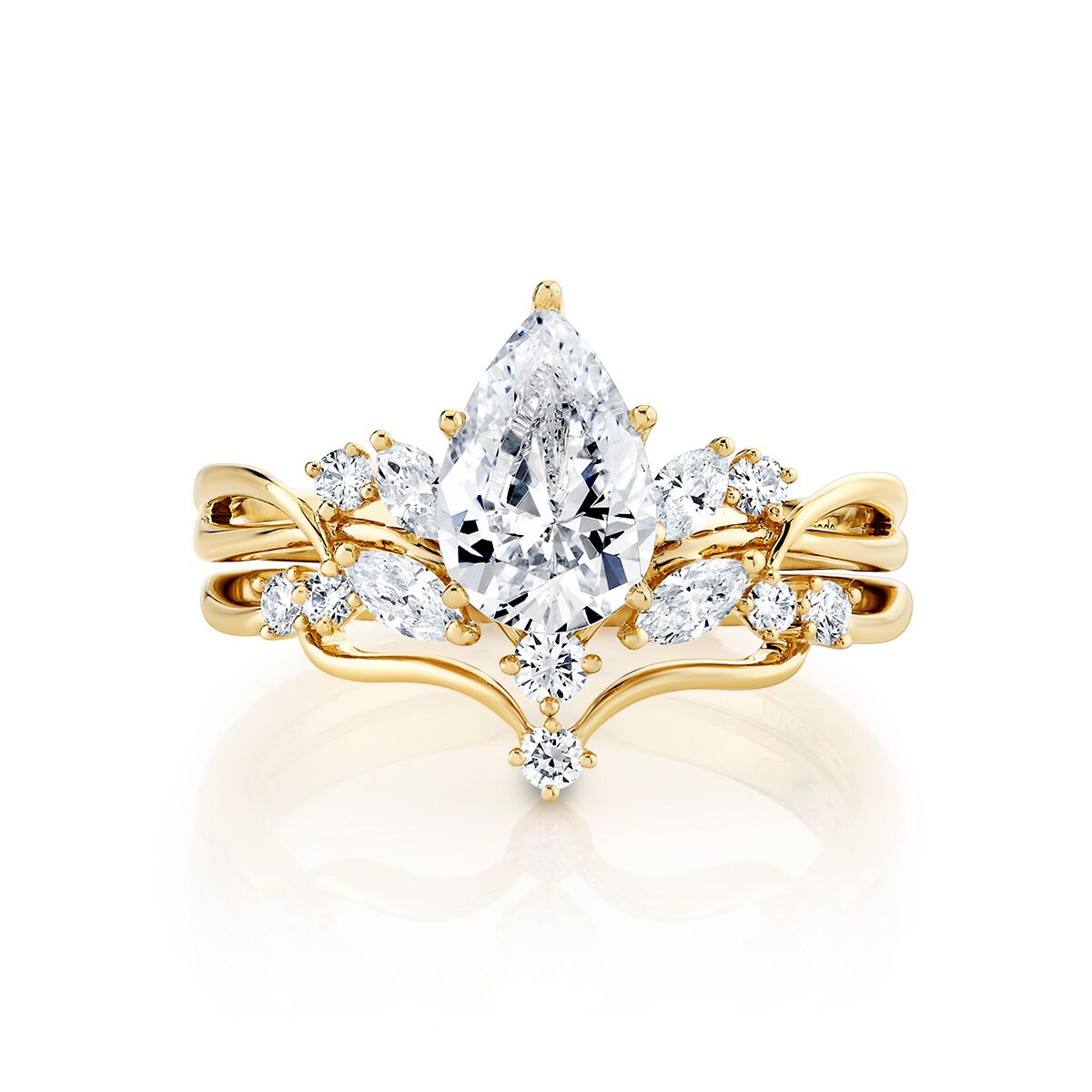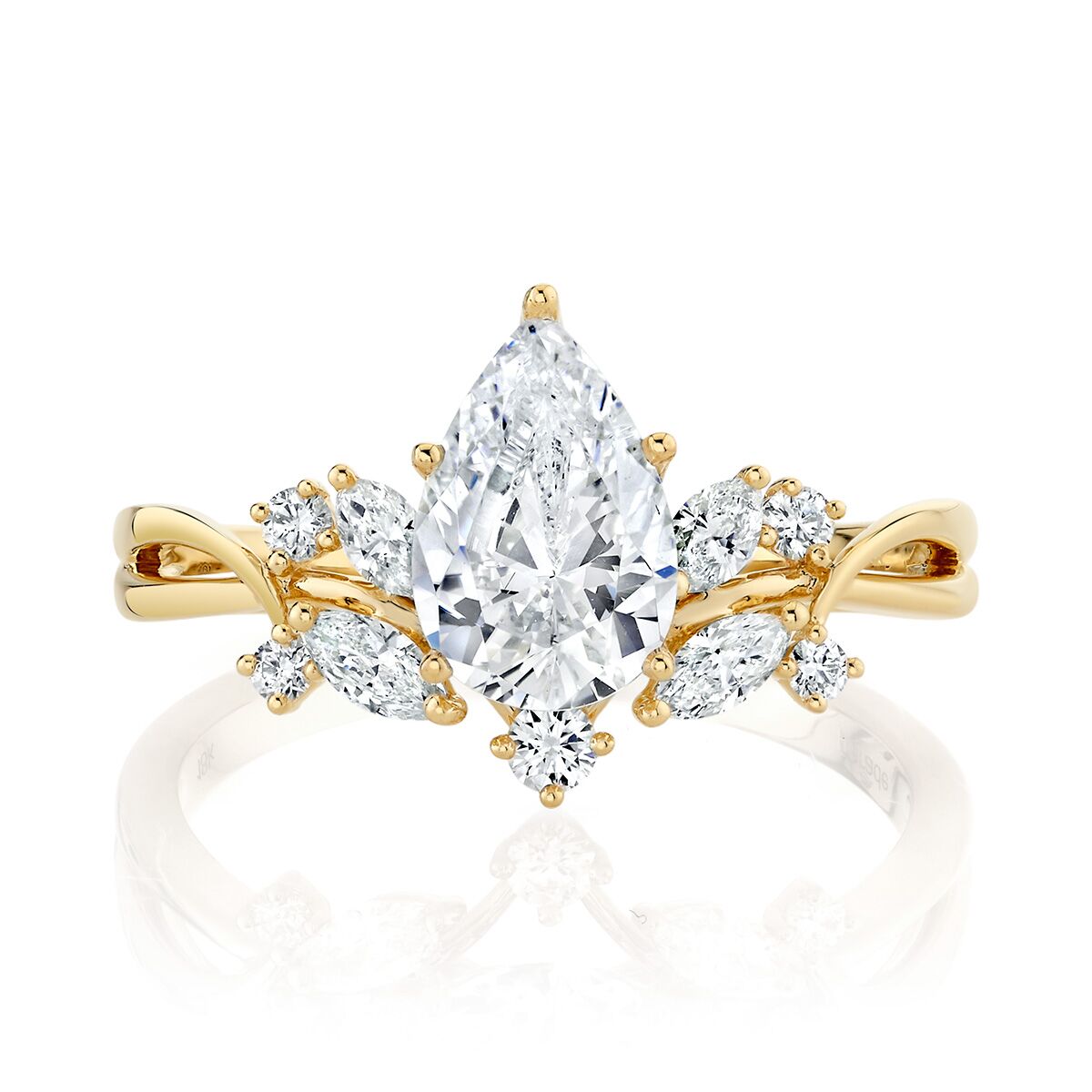Yellow Gold Diamond “Vine” Engagement Ring. This yellow gold ring features a magnificent pear center stone and a cluster of brilliant marquise and round diamonds that sweep across the finger like a diamond-encrusted vine. Available in Platinum, as well as 18K White, Yellow or Rose Gold.