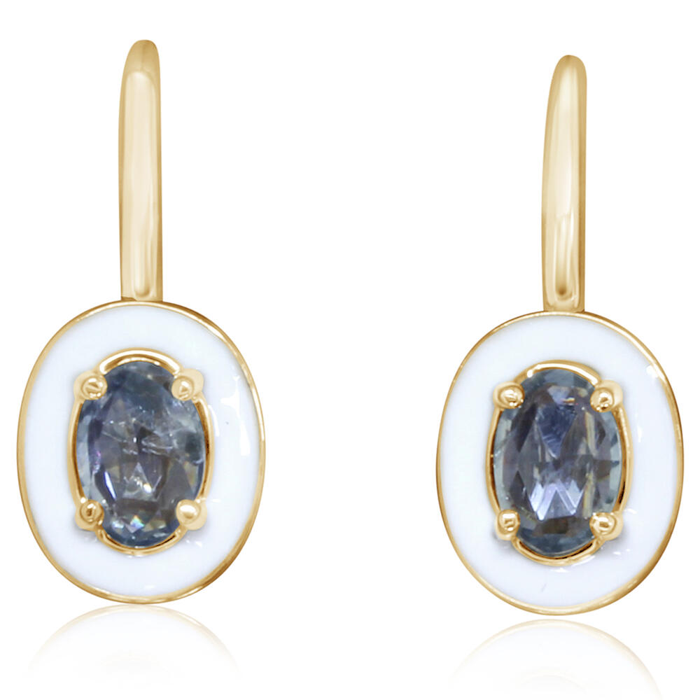14K Yellow Gold Montana Sapphire Earrings with White Enamel. Total gem weight: 1.26 ct.