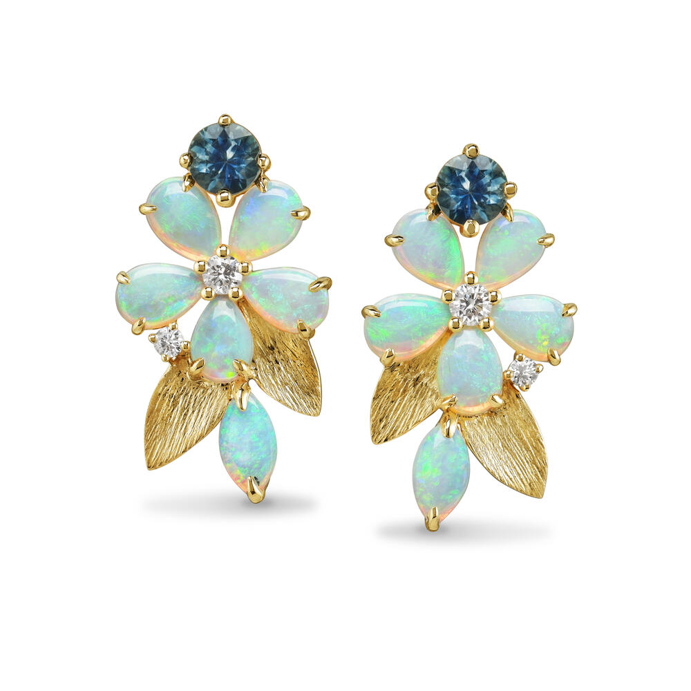 14K Yellow Gold Australian Opal/Montana Sapphire/ Diamond Flower Earrings. Total gem weight: 3.68 ct.