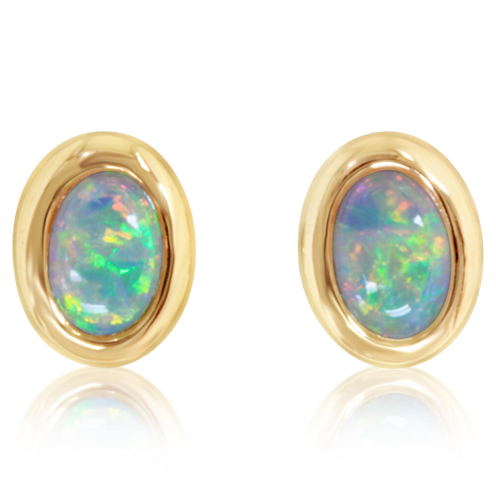 14K Yellow Gold 4×6 Oval Australian Opal Earrings. Total gem weight: 0.46 ct.