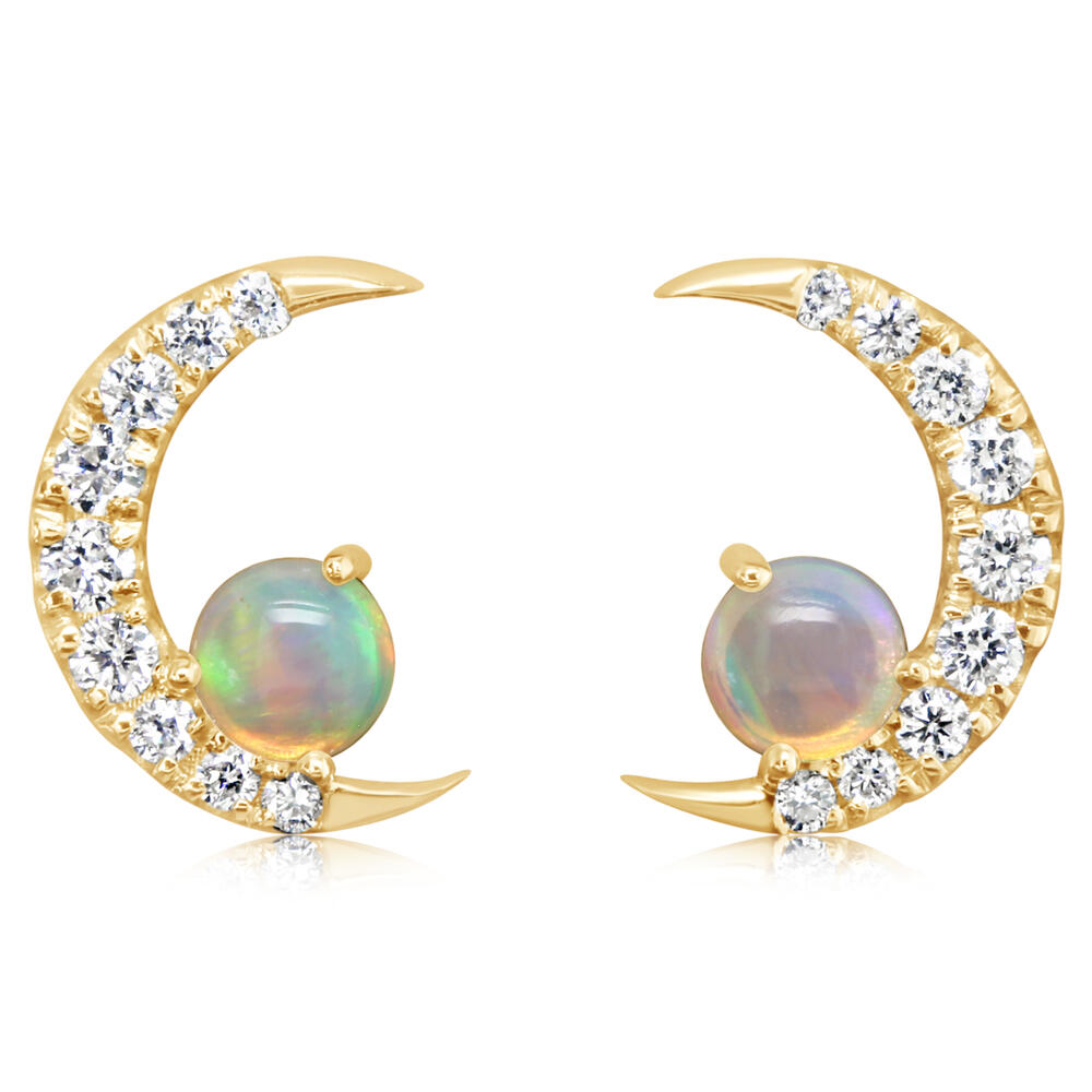 14K White Gold Australian Opal/Diamond Moon Earrings. Total gem weight: 0.14 ct.