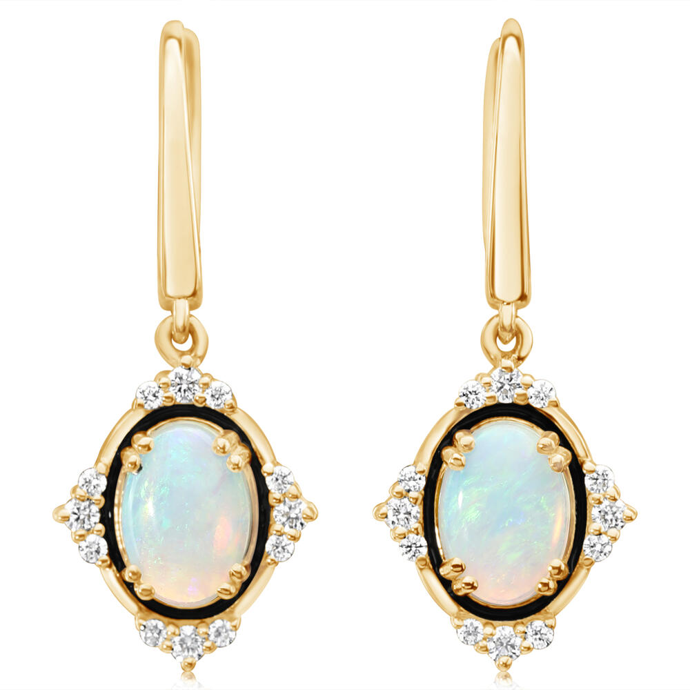 14K Yellow Gold Australian Opal/ Diamond Earrings with Black Enamel. Total gem weight: 0.92 ct.