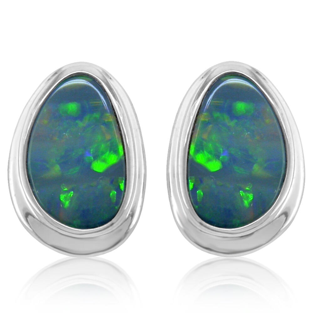 14K White Gold Australian Opal Doublet Wide Bezel Earrings. Sample Image. Actual piece might differ from current image. Total gem weight: Varies