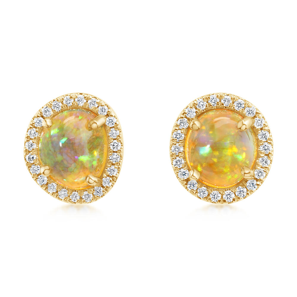 14K Yellow Gold Mexican Fire Opal/Diamond Earrings. This is a one of a kind piece. Total gem weight: 1.89 ct.