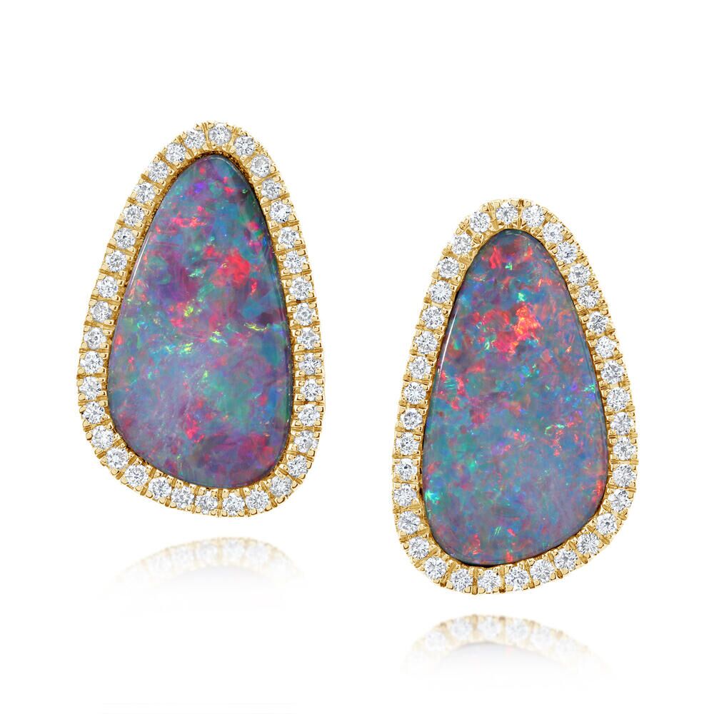 14K Yellow Gold Australian Opal Doublet/Diamond Earrings. This is a one of a kind piece. Total gem weight: 6.78 ct.