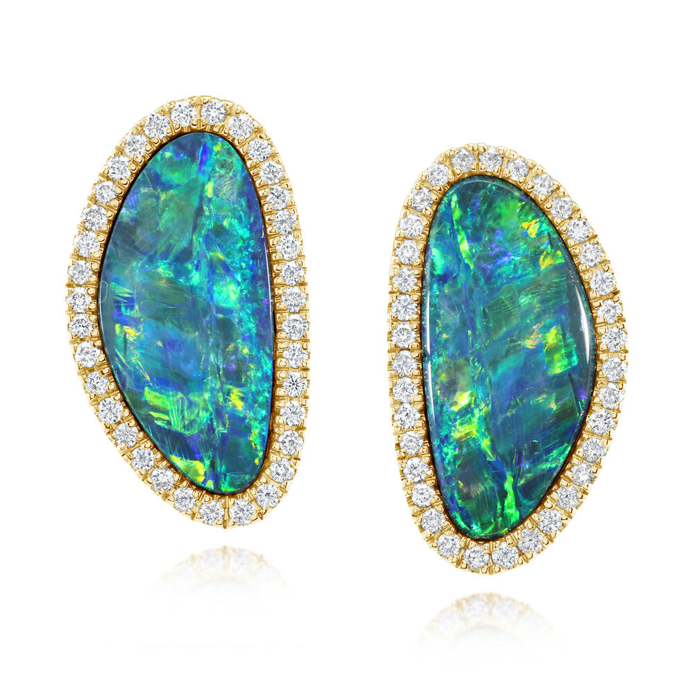 14K Yellow Gold Australian Opal Doublet/Diamond Earrings. This is a one of a kind piece. Total gem weight: 6.23 ct.