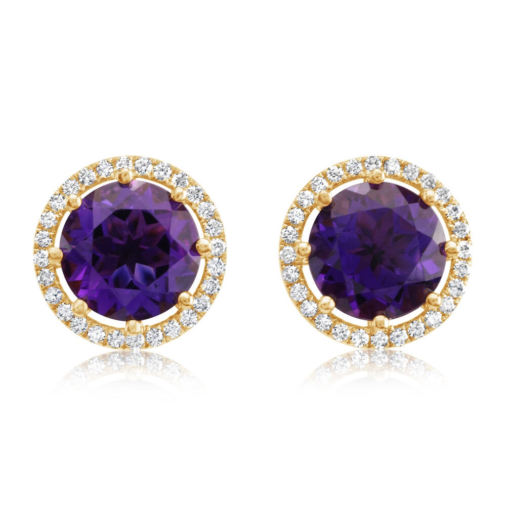 14K Yellow Gold 8mm Round Amethyst/Diamond Earrings. Total gem weight: 3.60 ct.