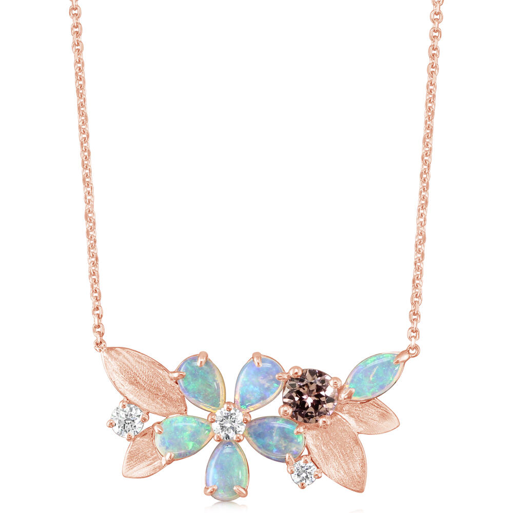 14K Rose Gold Australian Opal/ Lotus Garnet/Diamond Flower Neckpiece