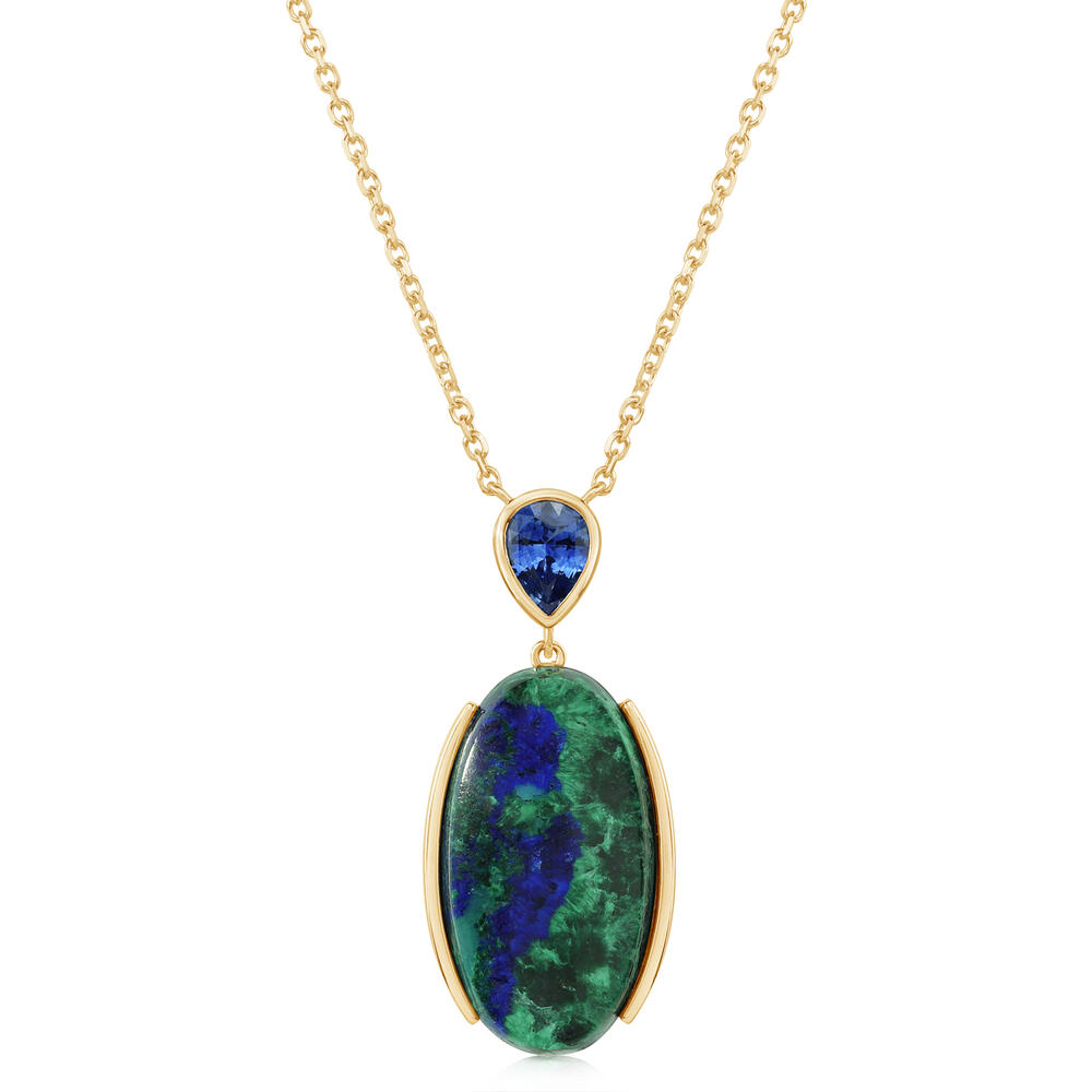 14K Yellow Gold Malachite Azurite/Ceylon Sapphire Neckpiece. This is a one of a kind piece. Total gem weight: 15.99 ct.
