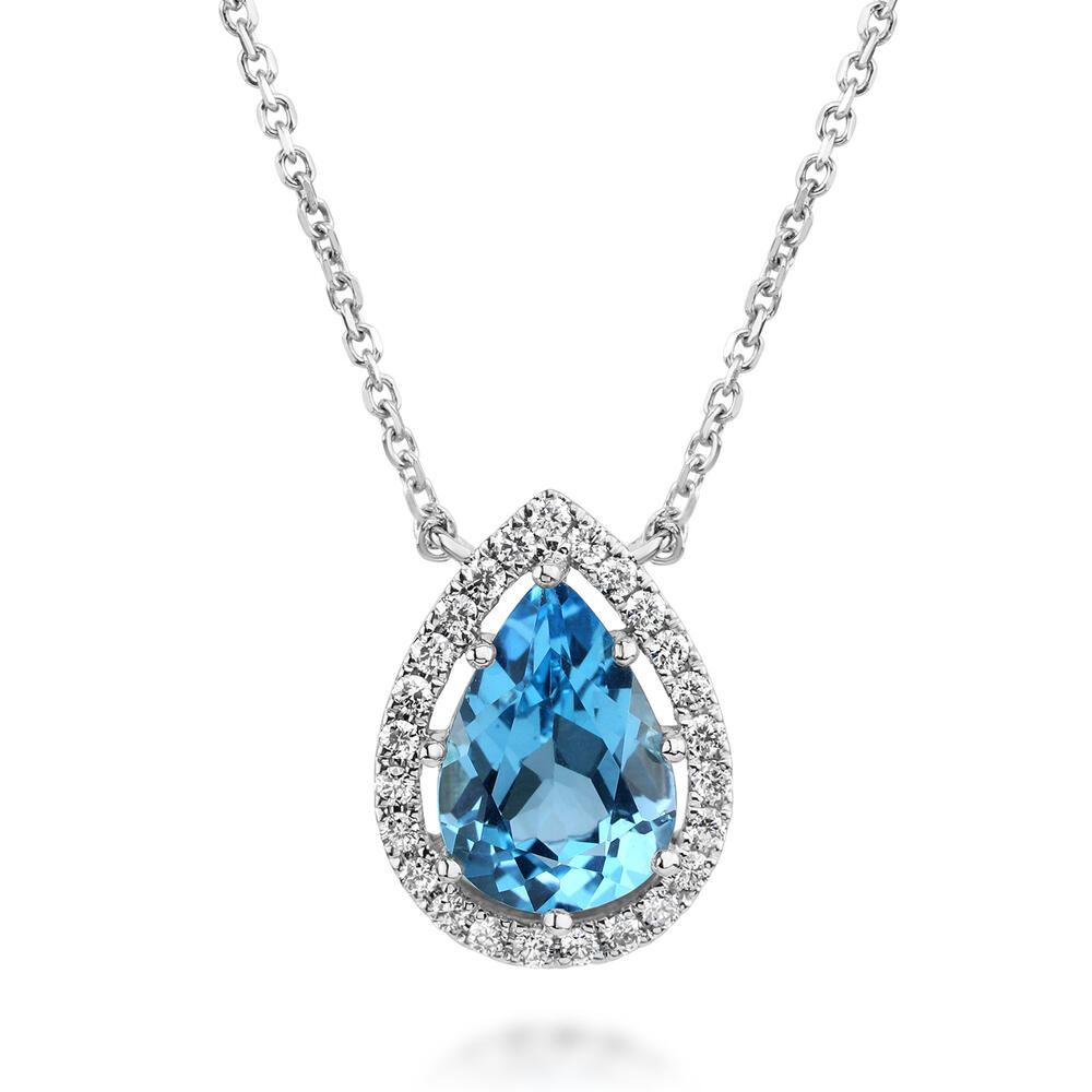 14K White Gold 10×7 Pear Blue Topaz/Diamond Neckpiece. Total gem weight: 2.20 ct.